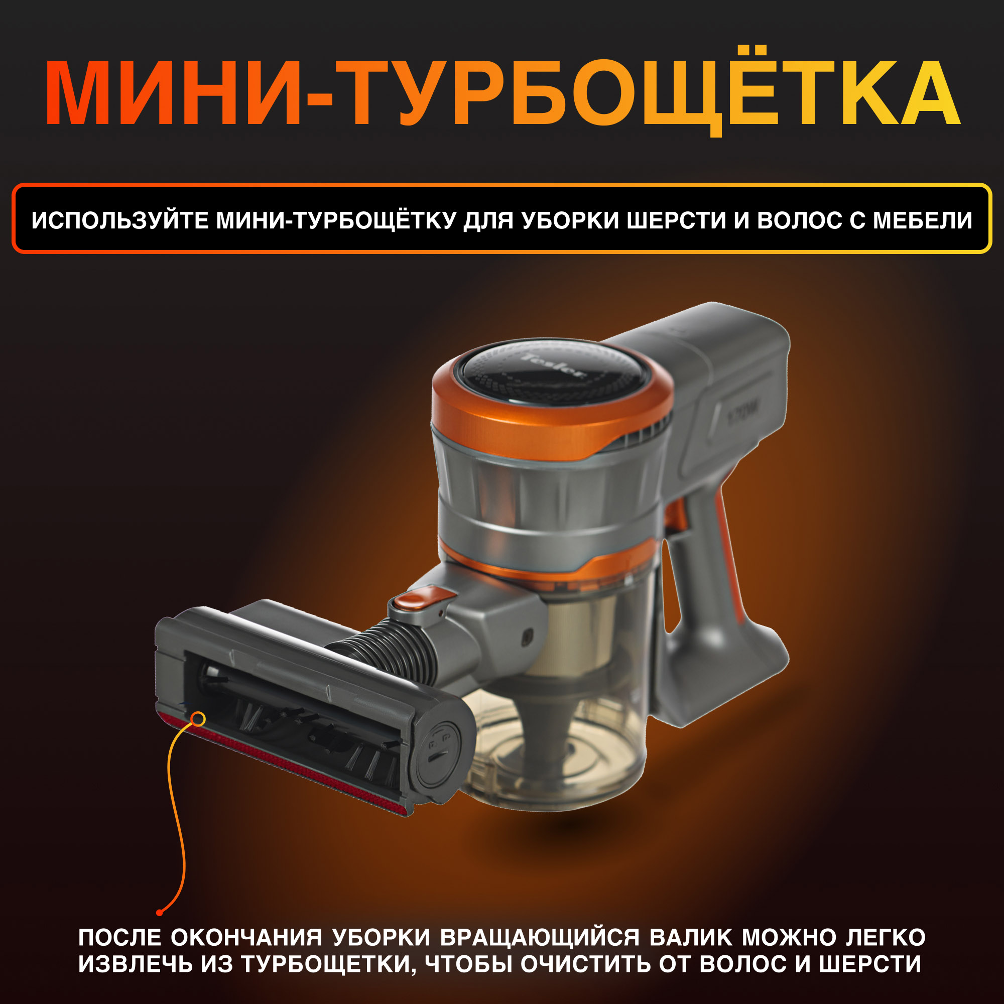 Турбощетка c LED-подсветкой может раскладываться до 180 градусов, что позволит вам пылесосить в труднодоступных местах, например, под диваном или кроватью. Щелевая насадка вытянет пыль, а мягкая щётка обработает обивку диванов и кресел.