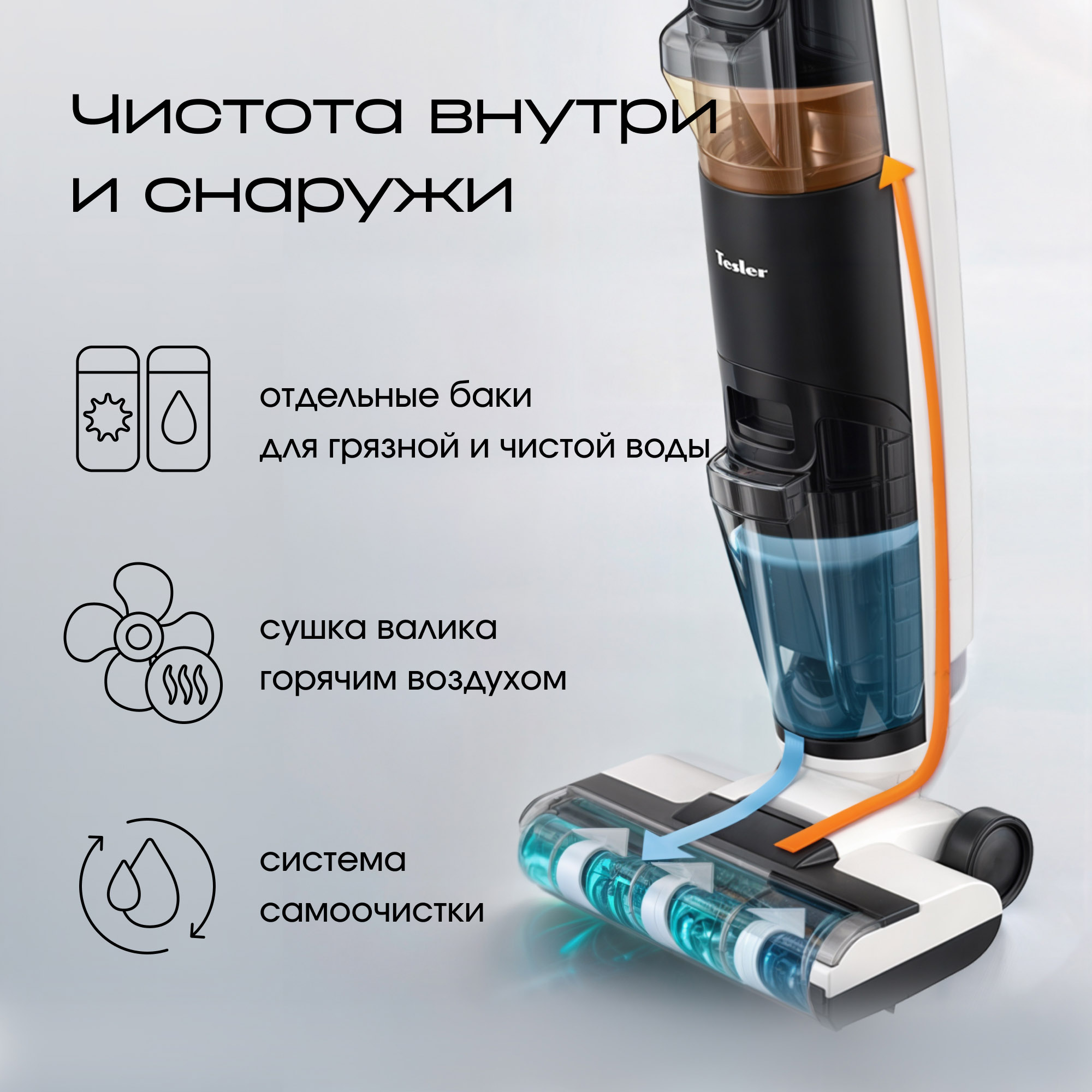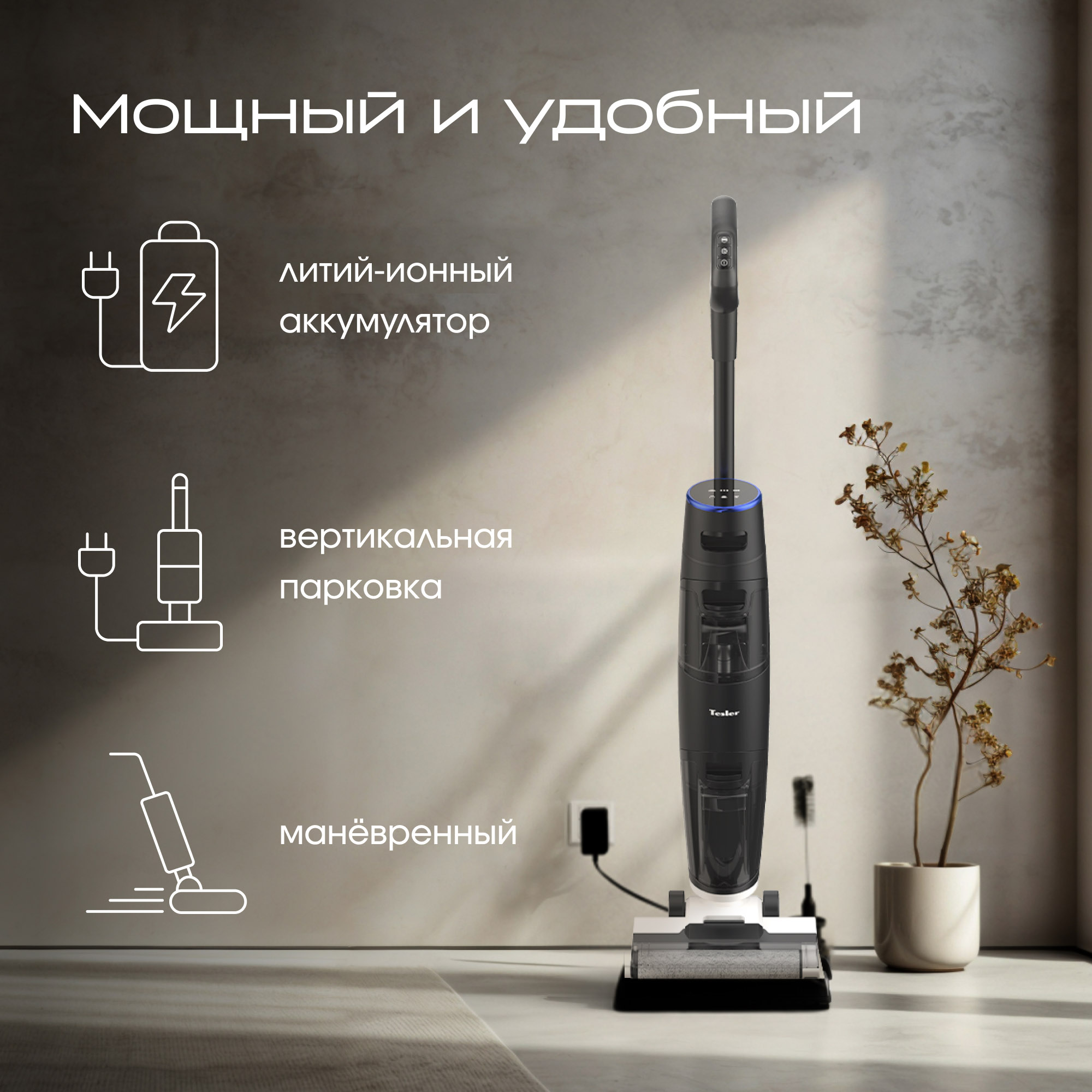 Моющий беспроводной пылесос Tesler Pure Storm WD-7300 превратит любую уборку в легкое и приятное занятие. Высокая мощность всасывания позволит избавиться от пролитой жидкости, пыли, шерсти домашних животных и въевшейся грязи. Доступны 3 режима: стандартный, турбо и режим протирки без подачи воды. Благодаря быстрому вращению щетки этот пылесос справится с самыми стойкими загрязнениями, а сочетание влажной и сухой уборки поможет добиться идеальной чистоты на любой поверхности.