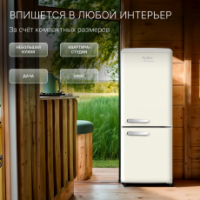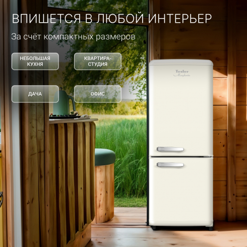 Ретро-стиль холодильника RB-107 наполняет пространство уютной эстетикой 60-х годов, а его компактные размеры позволяют рационально использовать пространство в небольших помещениях. Поэтому это идеальный вариант для небольших кухонь, квартир – студий и дачных домов.