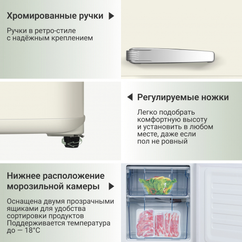 Несмотря на компактные габариты, ретро – холодильник оснащен полноценной морозильной камерой, в которой поддерживается температура до -18°С. Эргономичный дизайн внутреннего пространства помогает с комфортом расположить еду и напитки.