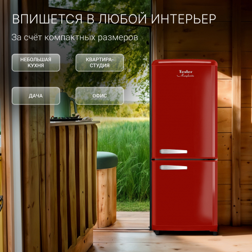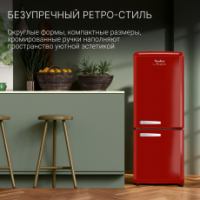 Ретро-стиль холодильника RB-107 наполняет пространство уютной эстетикой 60-х годов, а его компактные размеры позволяют рационально использовать пространство в небольших помещениях. Поэтому это идеальный вариант для небольших кухонь, квартир – студий и дачных домов.
