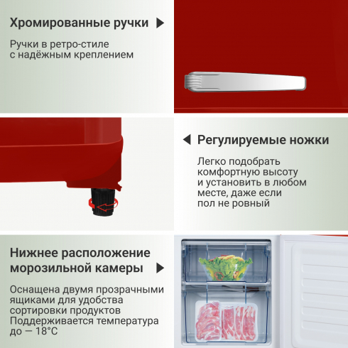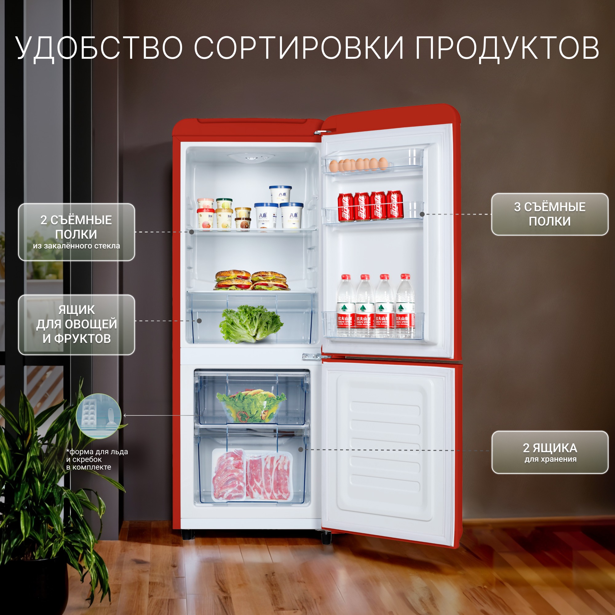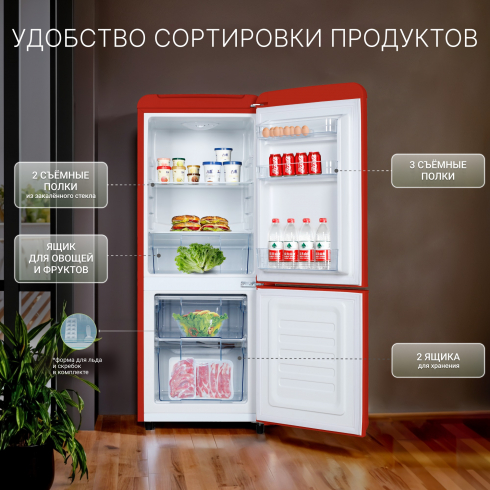 Несмотря на компактные габариты, ретро – холодильник оснащен полноценной морозильной камерой, в которой поддерживается температура до -18°С. Эргономичный дизайн внутреннего пространства помогает с комфортом расположить еду и напитки.