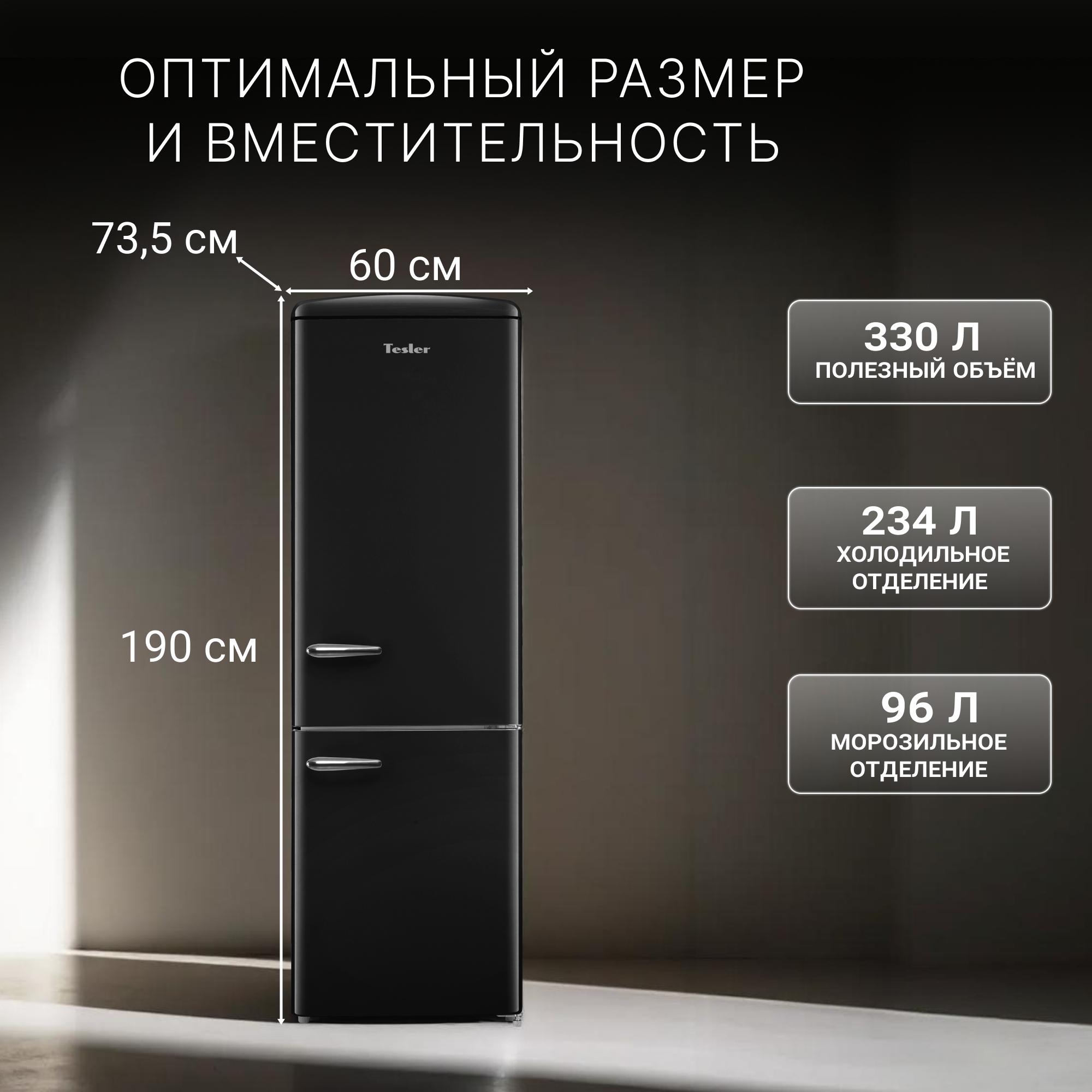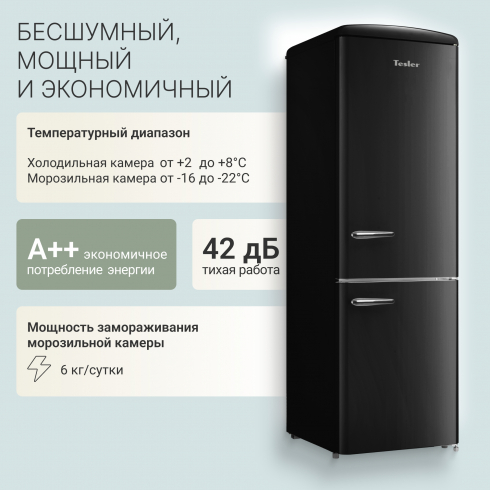 • Отдельностоящий, двухкамерный холодильник Tesler RB-330 сочетает в себе технологичность, высокое качество материалов и классический ретро-дизайн.