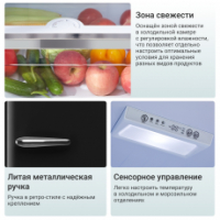 Модель, вдохновлённая эстетикой 60-х годов, станет ярким акцентом интерьера и подчеркнёт индивидуальность кухни. Лаконичные формы, оригинальные модные оттенки, литые металлические ручки придают холодильнику особый облик и уникальность.