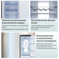 • Оснащен сенсорным управлением, зоной свежести с регулировкой влажности и металлической полкой для удобного расположения винных бутылок.