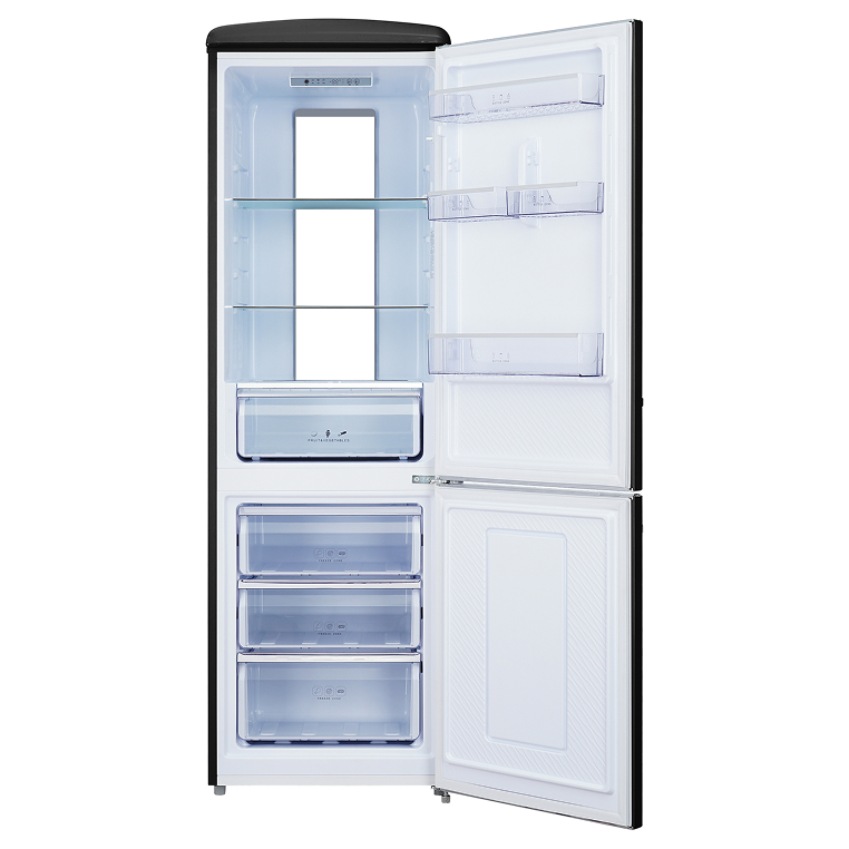 Внутри холодильной камеры расположены три полки из закалённого стекла и ящик для свежих овощей и фруктов, а также металлическая полка для винных бутылок. Дверца холодильника оборудована четырьмя универсальными карманами для компактного хранения яиц, соусов и лекарственных средств. В нижней части холодильной камеры расположена зона свежести с регулируемой влажностью, которая создаёт оптимальные условия для хранения фруктов и овощей. В комплекте с холодильником поставляются лотки для яиц и льда.