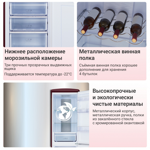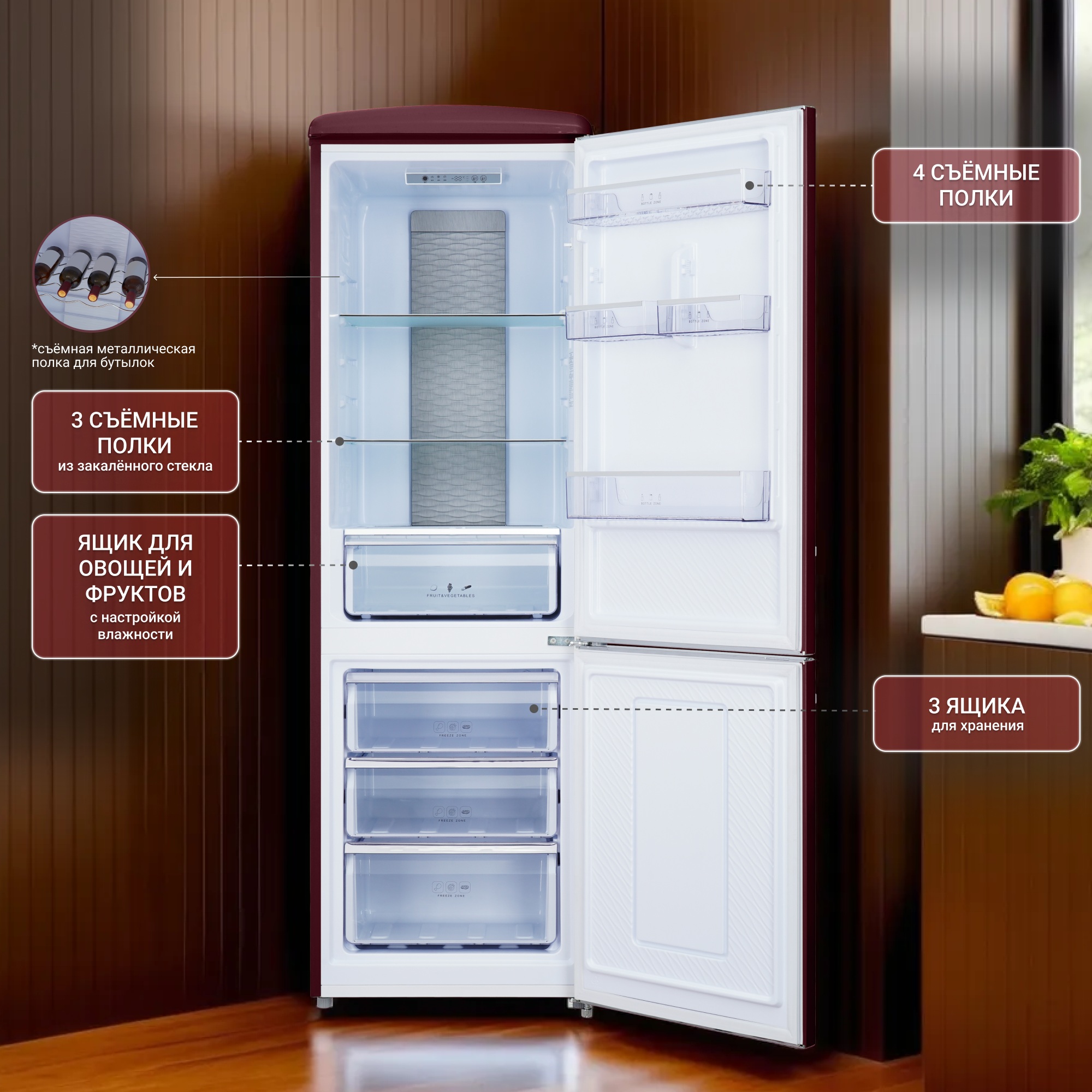 В холодильной камере располагаются 3 устойчивые, прочные, легко очищающиеся полки из закаленного стекла и отдельная металлическая полка для винных бутылок. На дверце располагаются 4 кармана для яиц, соусов, контейнеров с едой, лекарств. В нижней части холодильного отделения расположена зона свежести с регулируемым уровнем влажности обеспечивающая оптимальные условия для хранения различных продуктов.