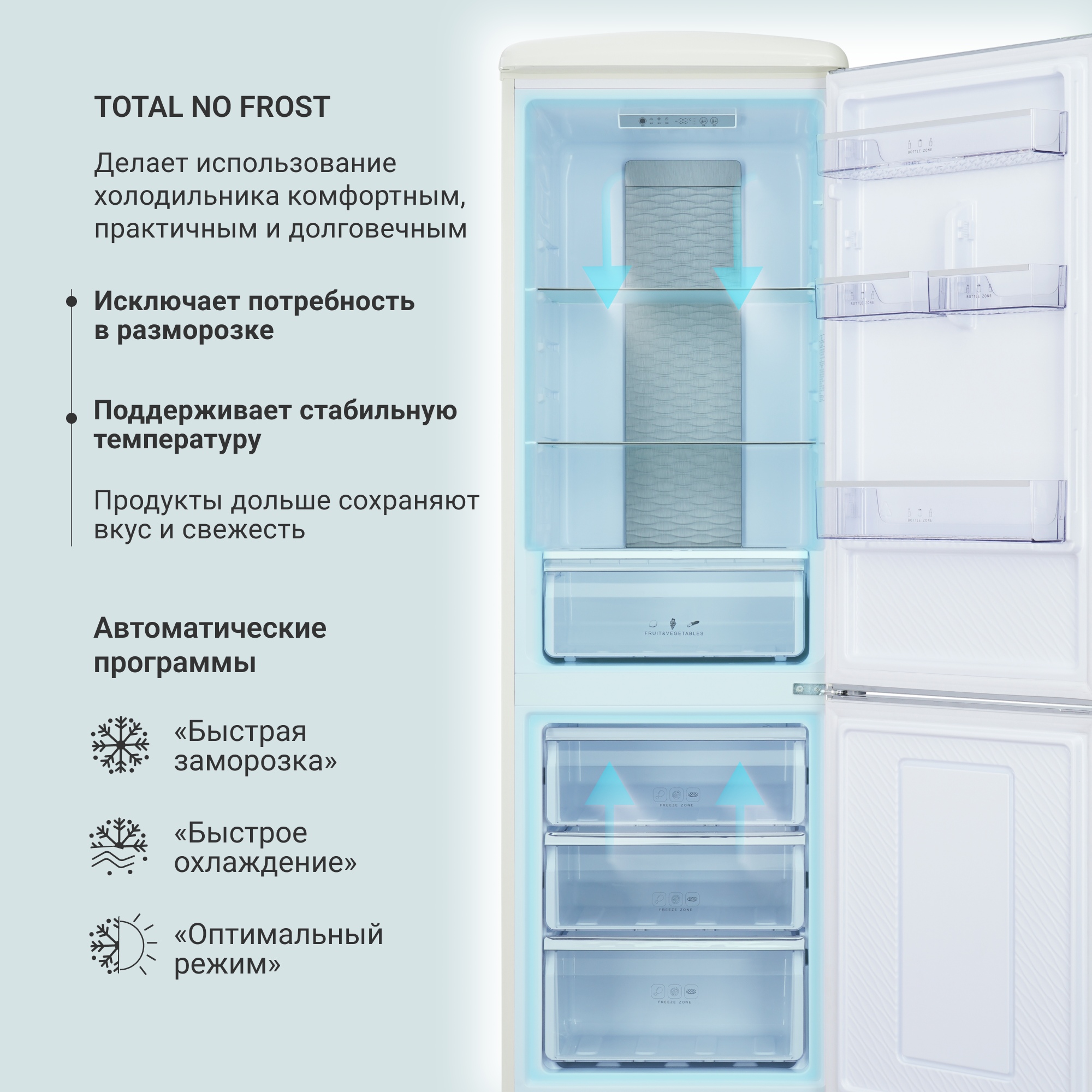 Tesler RB-335 оснащён системой охлаждения FULL NO FROST, которая избавляет от необходимости размораживания, поддерживает стабильную температуру, позволяя продуктам дольше сохранять вкусовые качества и свежесть.