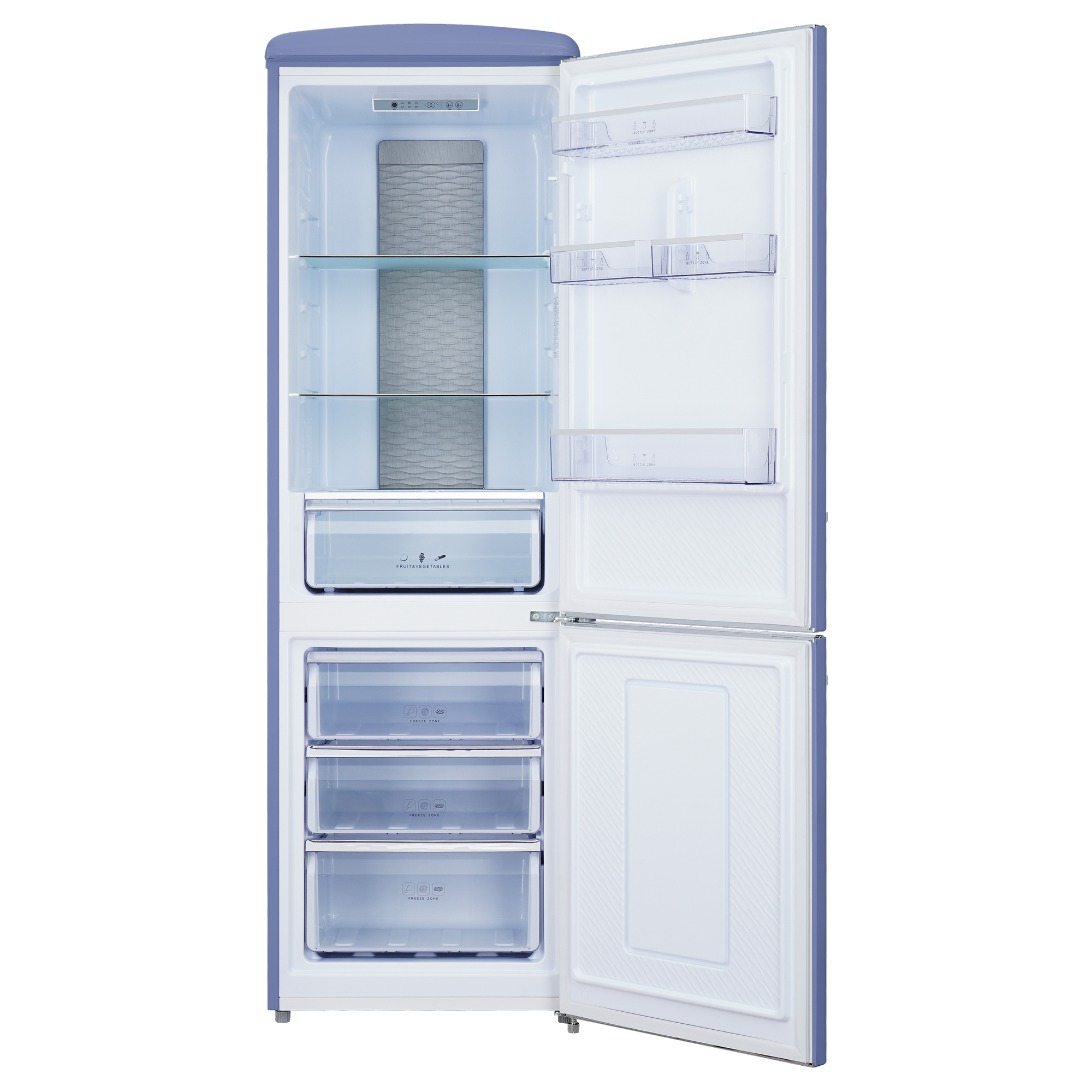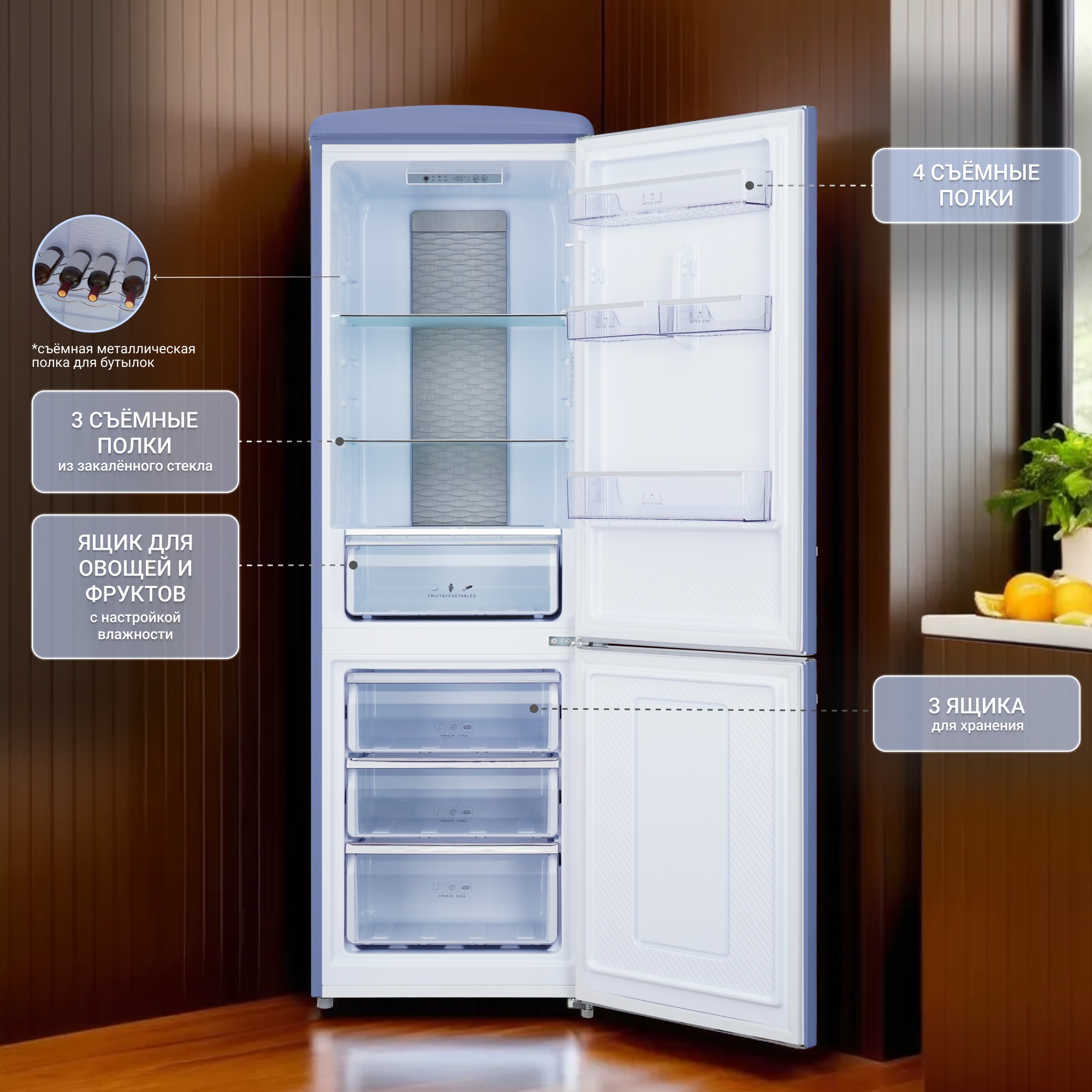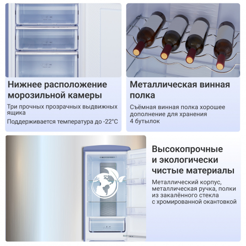 В холодильной камере располагаются 3 устойчивые, прочные, легко очищающиеся полки из закаленного стекла и отдельная металлическая полка для винных бутылок. На дверце располагаются 4 кармана для яиц, соусов, контейнеров с едой, лекарств. В нижней части холодильного отделения расположена зона свежести с регулируемым уровнем влажности обеспечивающая оптимальные условия для хранения различных продуктов.