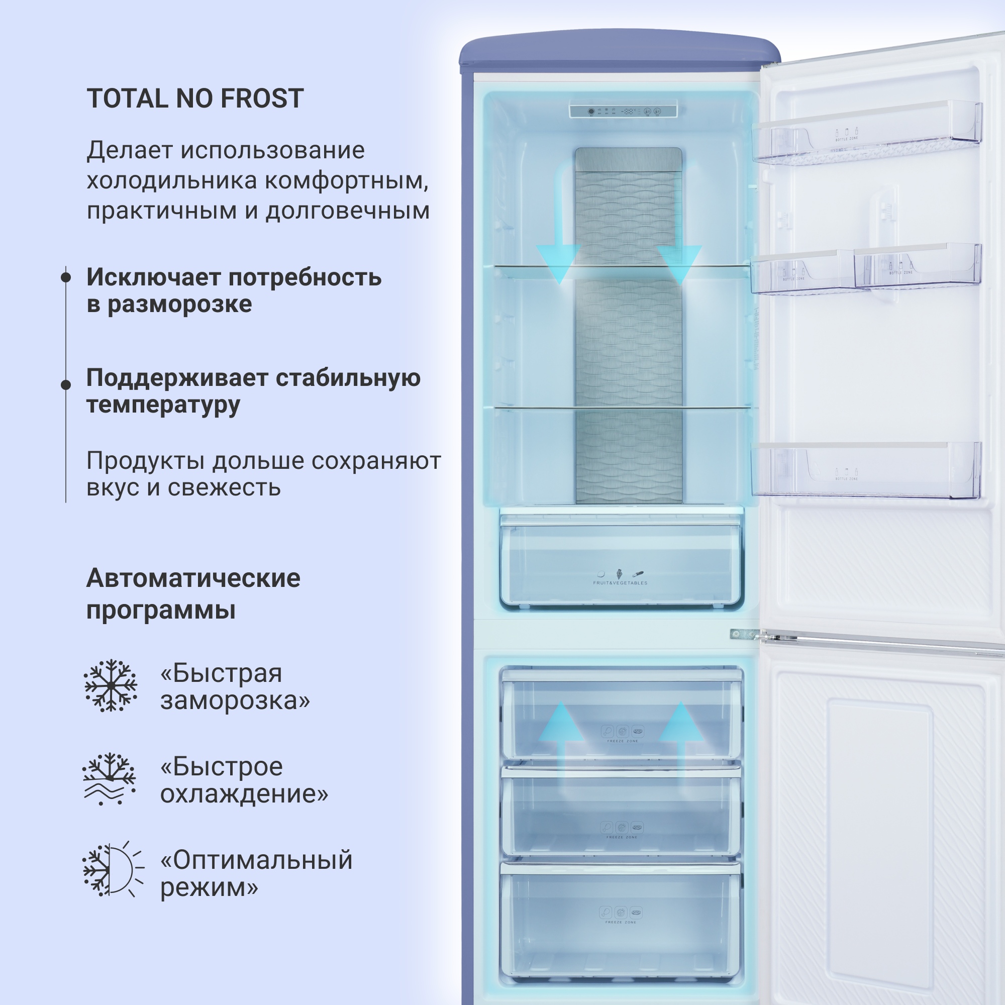 Три автоматических режима: «быстрая заморозка», «быстрое охлаждение» и «оптимальный режим» позволяют быстро адаптировать температуру под текущие потребности.