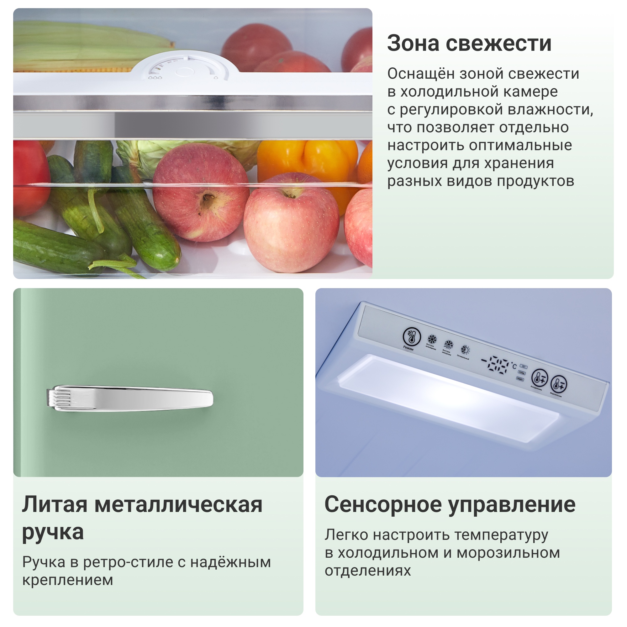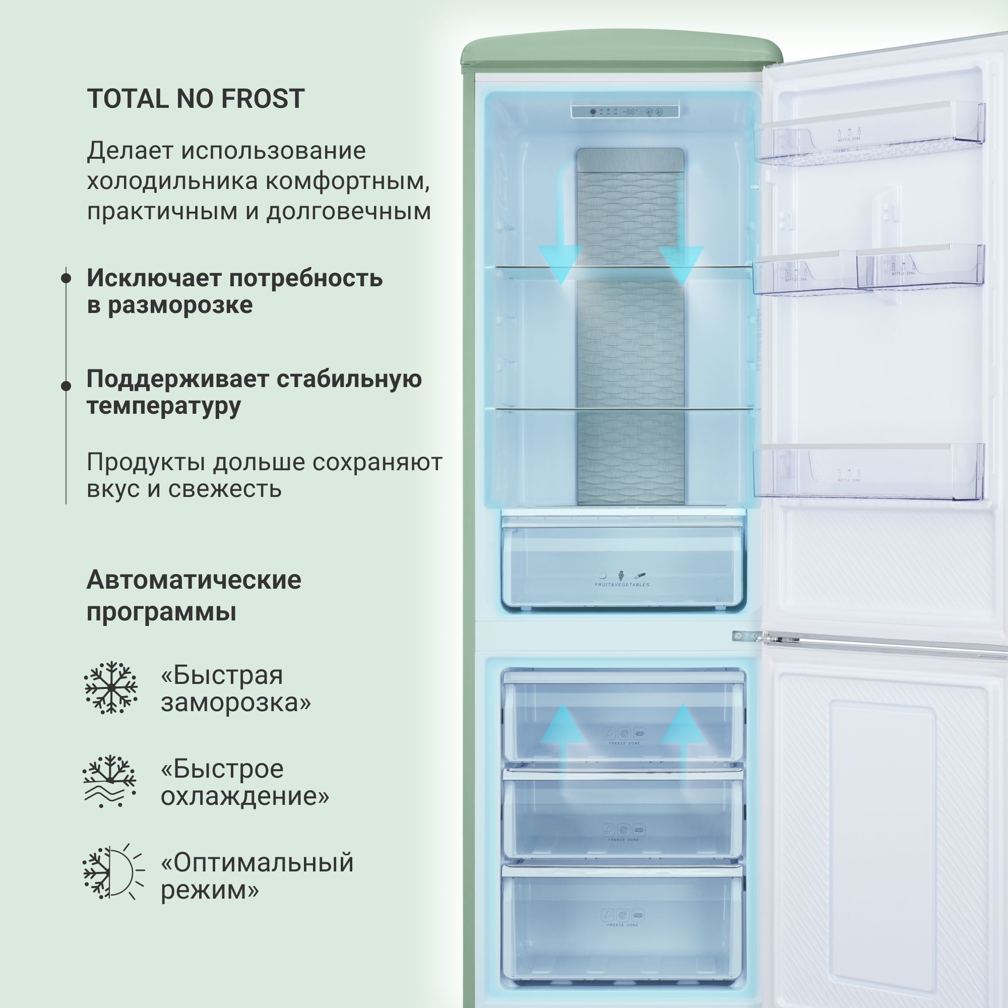 Три автоматических режима: «быстрая заморозка», «быстрое охлаждение» и «оптимальный режим» позволяют быстро адаптировать температуру под текущие потребности.
