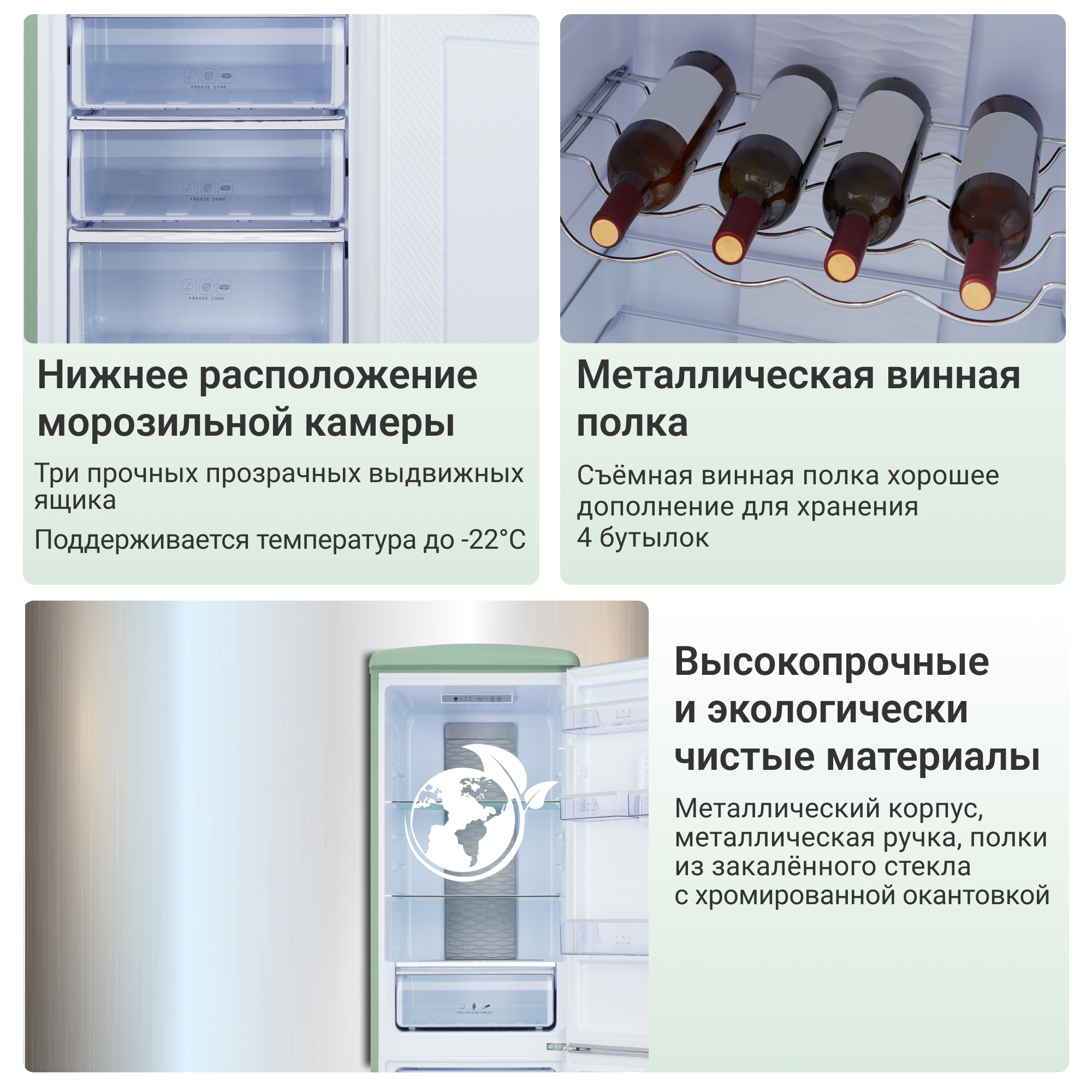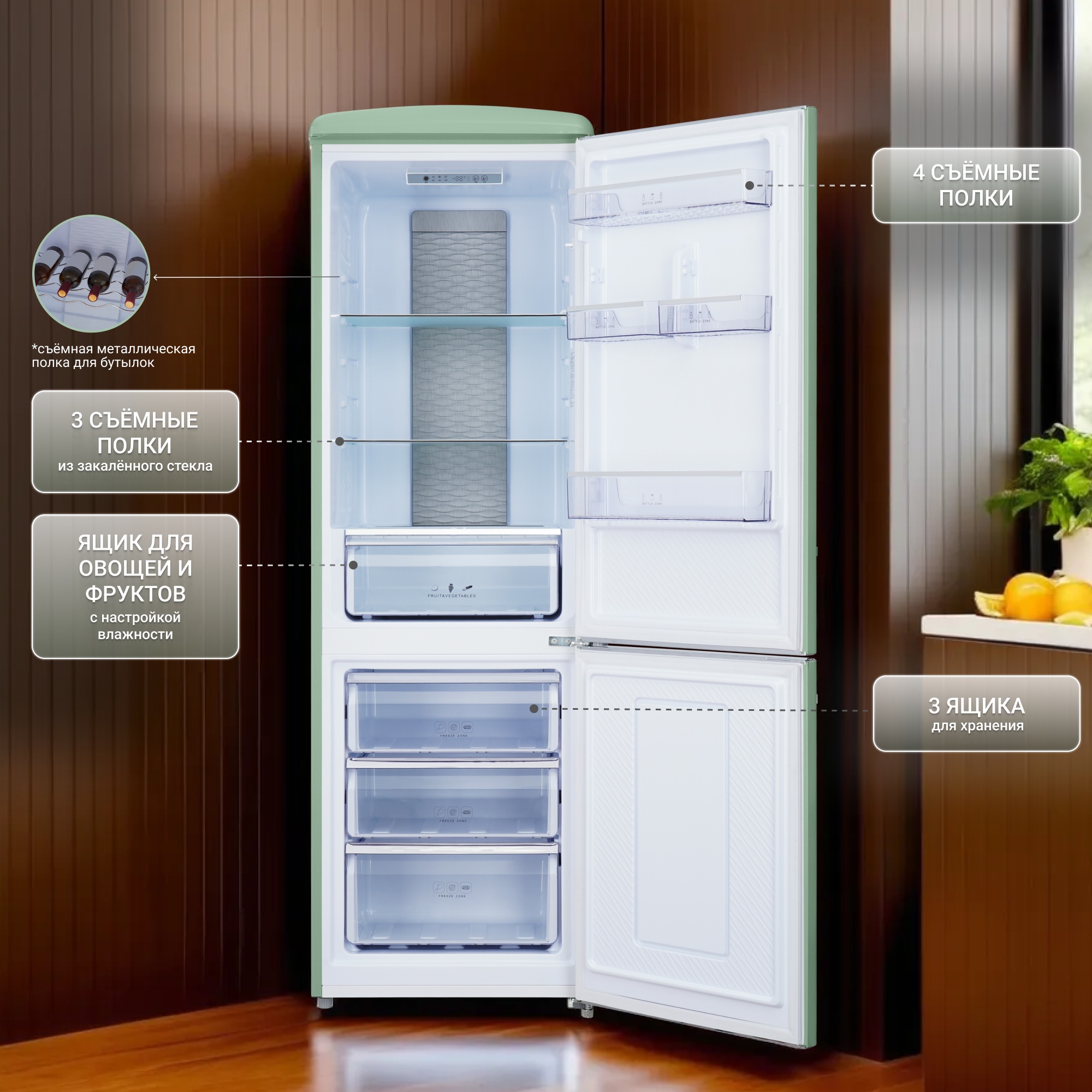 В холодильной камере располагаются 3 устойчивые, прочные, легко очищающиеся полки из закаленного стекла и отдельная металлическая полка для винных бутылок. На дверце располагаются 4 кармана для яиц, соусов, контейнеров с едой, лекарств. В нижней части холодильного отделения расположена зона свежести с регулируемым уровнем влажности обеспечивающая оптимальные условия для хранения различных продуктов.