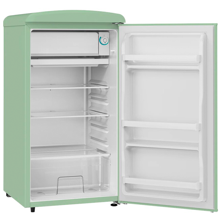 Полезный объём холодильника составляет 90 л. Внутреннее пространство организовано просто и удобно: в верхней части расположено отделение с пониженной температурой, ниже — стеклянные полки для повседневных продуктов, в дверце предусмотрены полки для напитков, соусов и небольших упаковок. Внизу находится ящик для овощей и фруктов. Такая компоновка помогает рационально использовать каждый уровень хранения и поддерживать порядок внутри камеры.