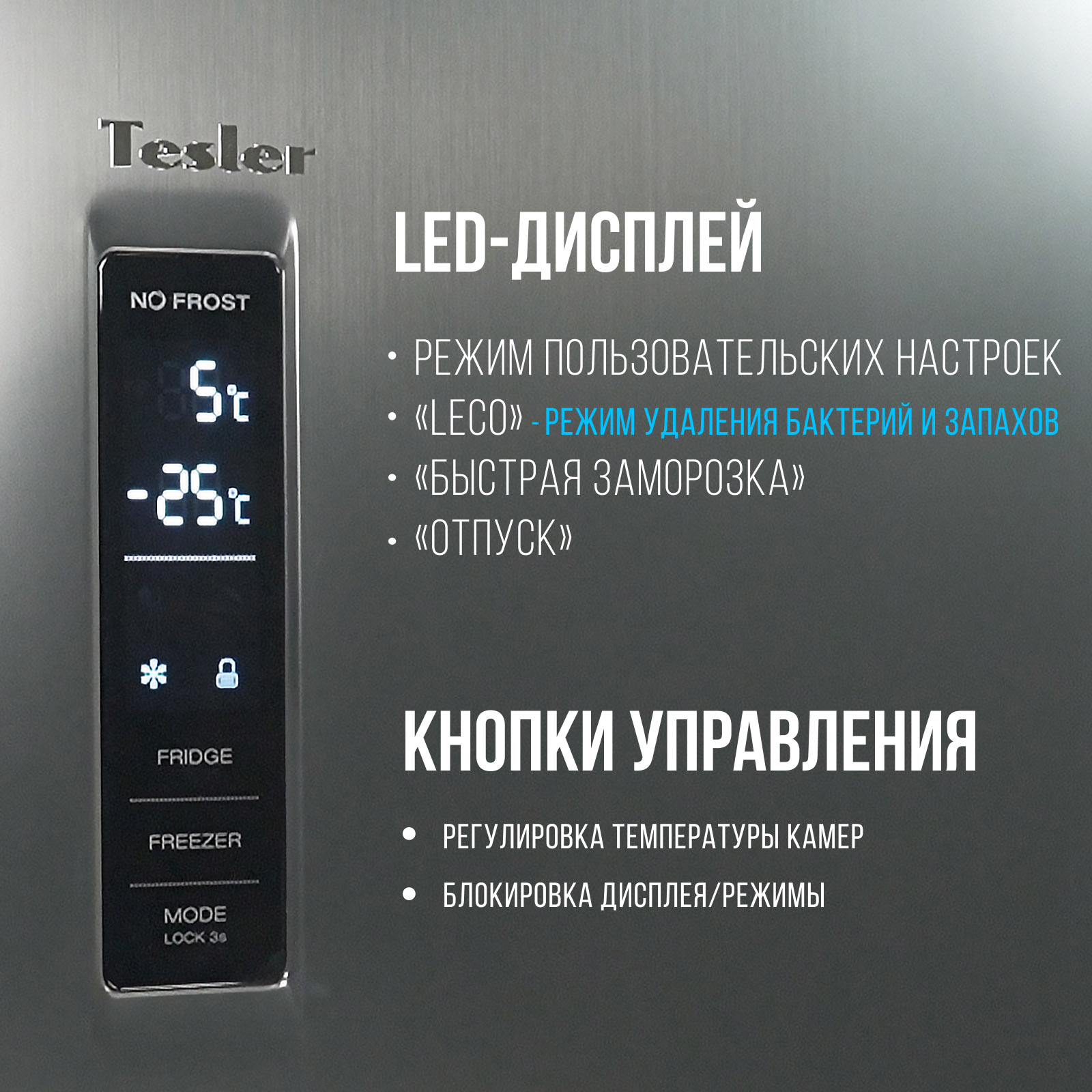 Сенсорная панель управления с дисплеем позволяет контролировать температуру и быстро менять ее в случае необходимости. Кроме этого предусмотрены дополнительные режимы - "Эко", "Быстрая заморозка" и "Отпуск".