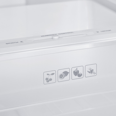 Зона свежести с регулируемым уровнем влажности поможет подобрать оптимальные условия хранения как для овощей или свежей зелени, так и для фруктов.