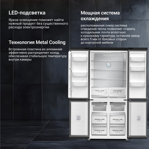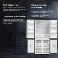 Общий объём холодильника составляет 487л, полезный объём - 485 л. Цветной LED дисплей и интуитивно-понятное меню помогут настроить нужные параметры для каждой из камер по отдельности и активировать предустановленные режимы.