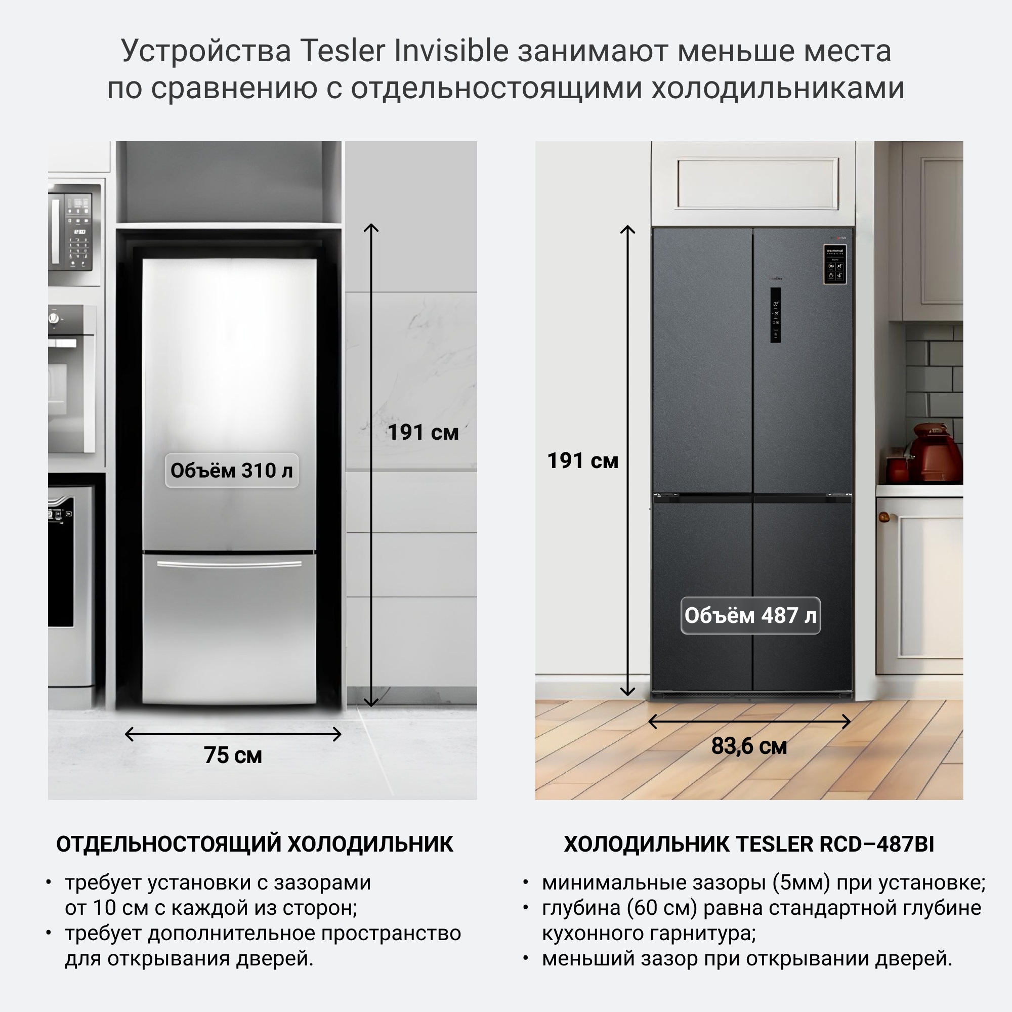 Благодаря встроенному инверторному компрессору холодильник Tesler RCD-487BI тихо работает, позволяет экономить за счёт низкого потребления электроэнергии, быстрее восстанавливает температуру после загрузки большого количества не охлаждённых продуктов, что положительно сказывается на их свежести и сохранности.