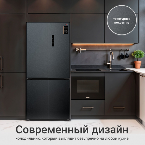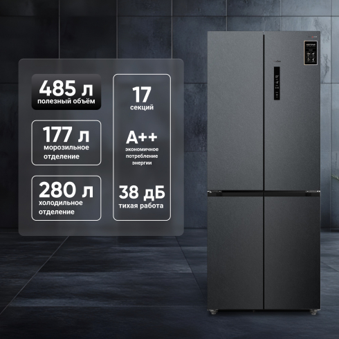 Общий объём холодильника составляет 487л, полезный объём - 485 л. Цветной LED дисплей и интуитивно-понятное меню помогут настроить нужные параметры для каждой из камер по отдельности и активировать предустановленные режимы.