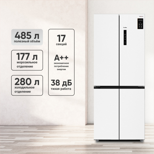 Общий объём холодильника составляет 487л, полезный объём - 485 л. Цветной LED дисплей и интуитивно-понятное меню помогут настроить нужные параметры для каждой из камер по отдельности и активировать предустановленные режимы.