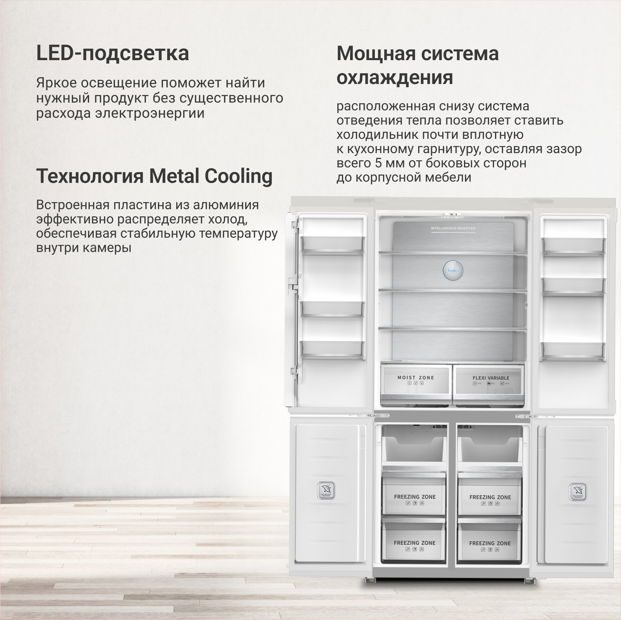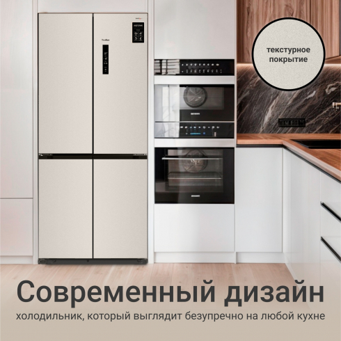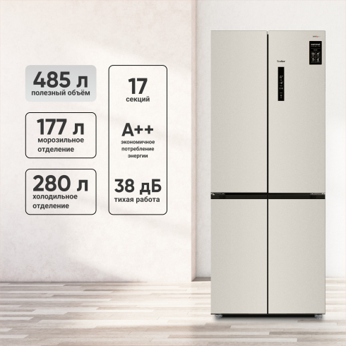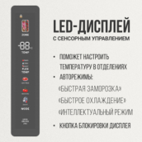 Общий объём холодильника составляет 487л, полезный объём - 485 л. Цветной LED дисплей и интуитивно-понятное меню помогут настроить нужные параметры для каждой из камер по отдельности и активировать предустановленные режимы.