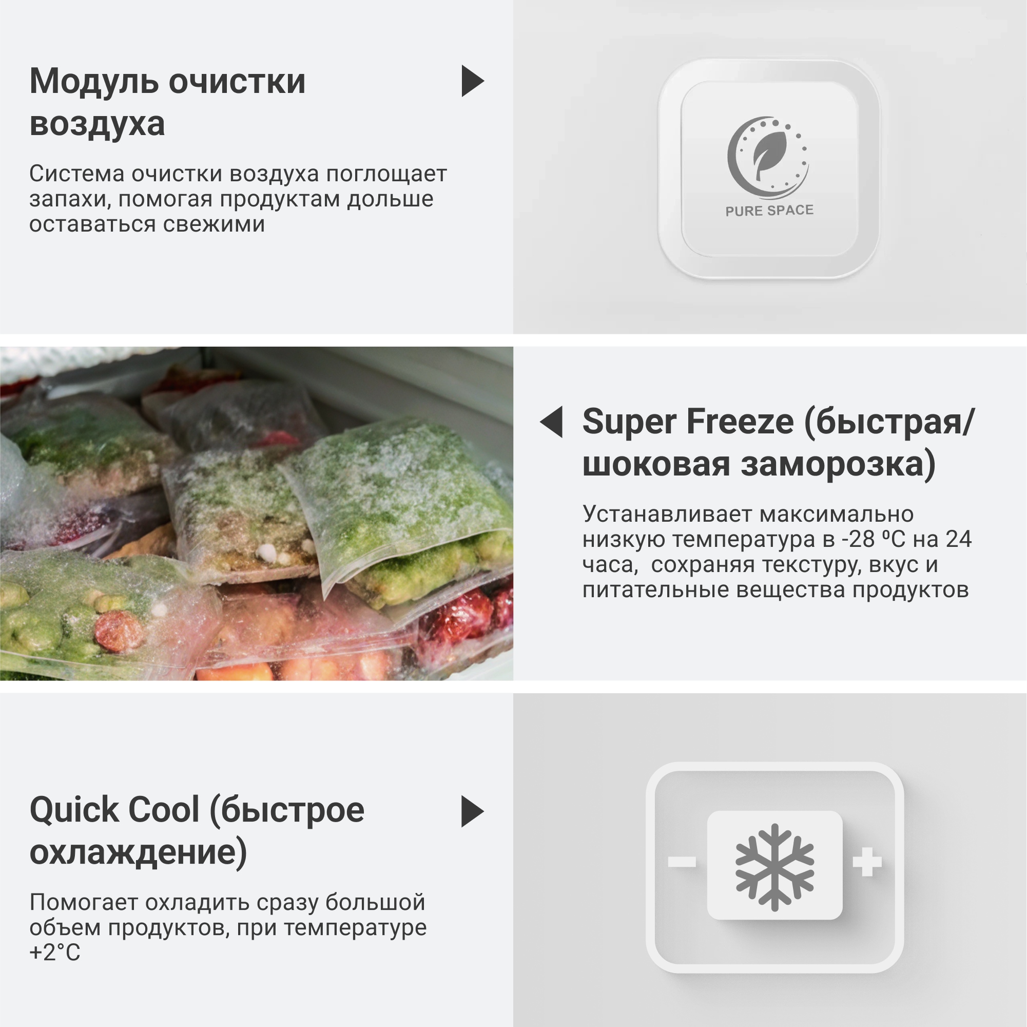 • Режимы Super Freeze (быстрая заморозка) и Quick Cool (быстрое охлаждение) позволяют сохранить вкус и полезные свойства большого объема продуктов.