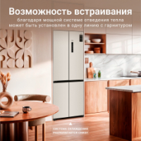 Дизайн холодильника предусматривает возможность частичной интеграции в кухонную мебель. Глубина корпуса, составляющая 600 мм, обеспечивает монтаж холодильника в единую линию со стандартными элементами кухонного гарнитура. При этом допустимые зазоры с кухонной мебелью не превышают 5 мм.