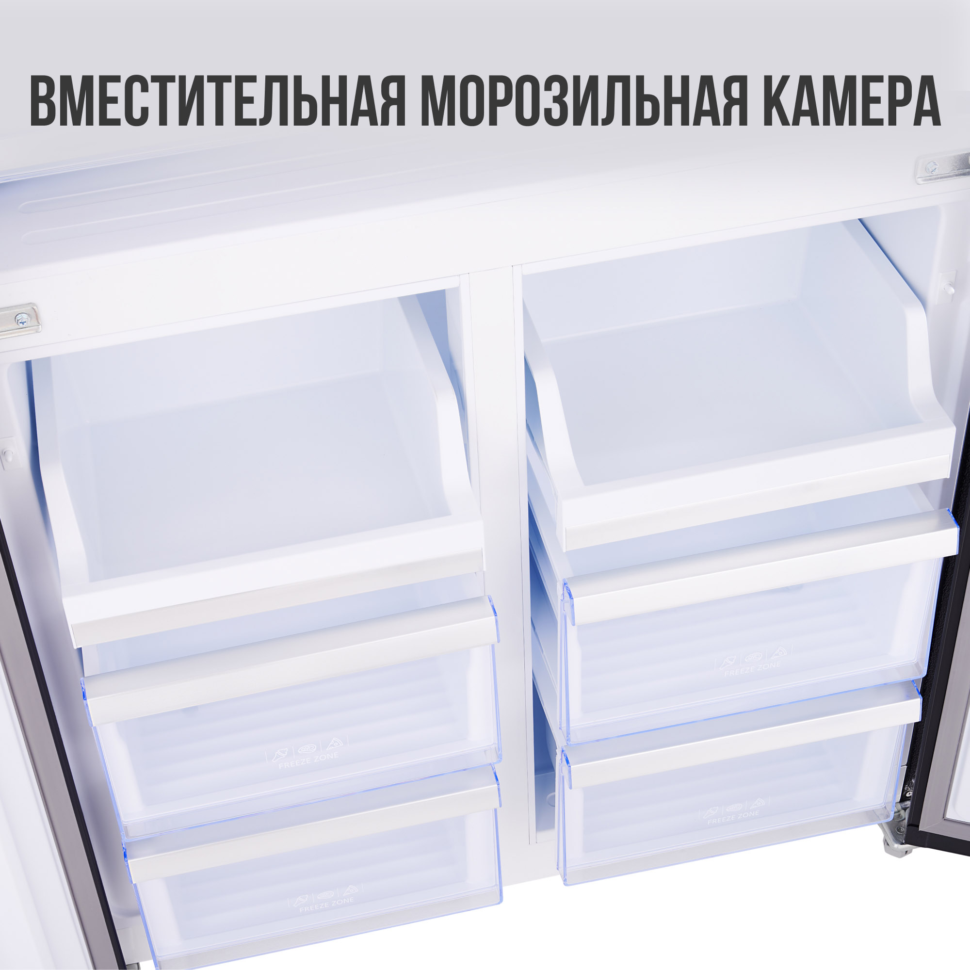 4 больших ящика и 2 выдвижных поддона в морозильном отделении предоставят вам достаточно места для длительного хранения продуктов и заморозки заготовок на зиму.