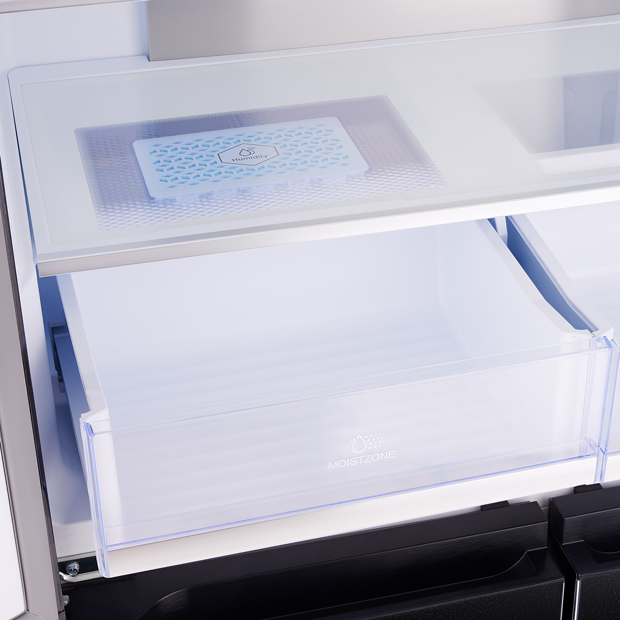 Фреш-зона позаботится о том, чтобы можно было реже покупать фрукты, овощи и зелень. Левая секция  - это отделение повышенной влажности для хранения овощей, арбузов, зеленых бананов, клубники и зелени.