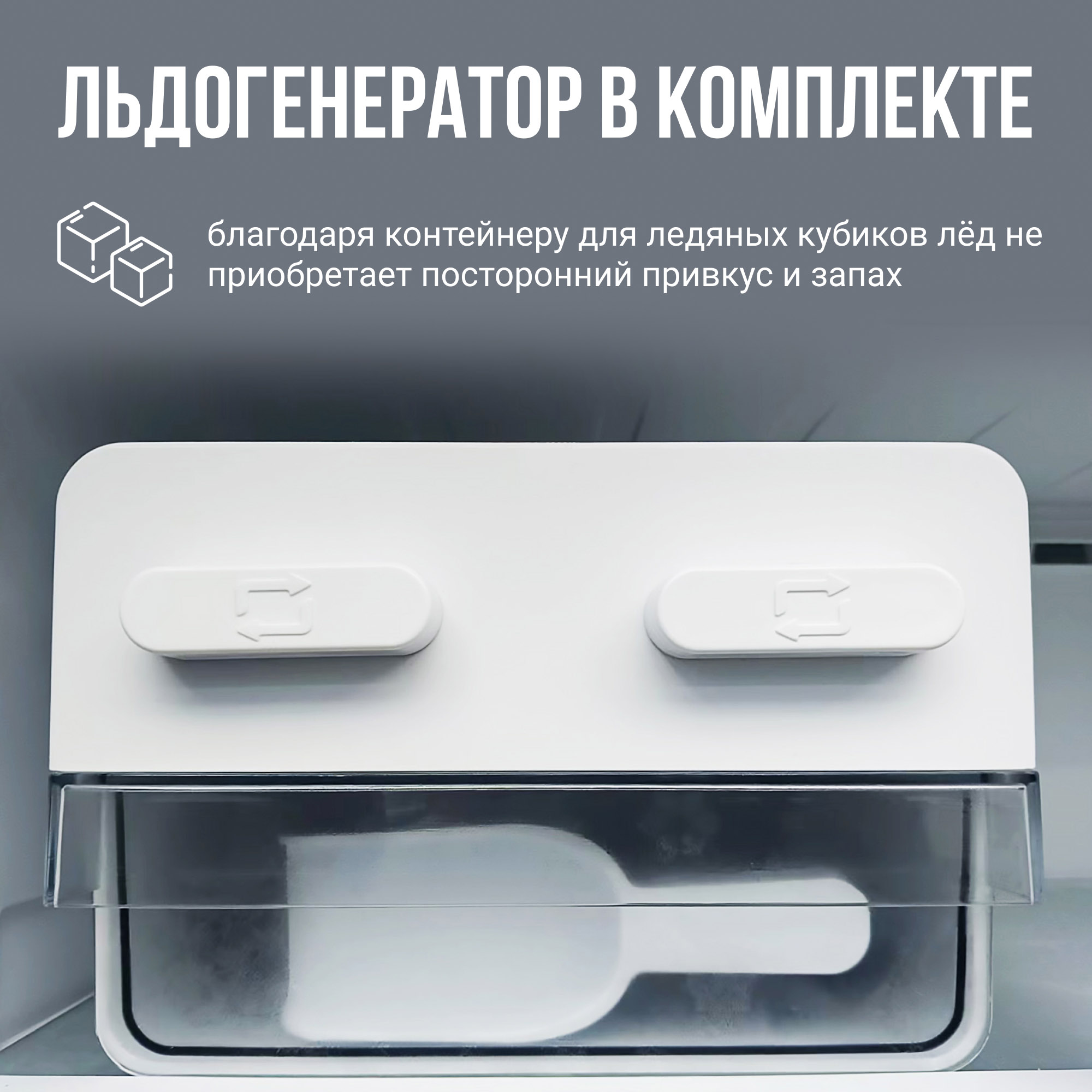 В морозильной камере предусмотрено особое отделение для изготовления льда, выполненное в виде контейнера с формочками. Залейте туда воду, и после замораживания вы сможете легко извлечь готовые кубики льда, повернув рычаг. При необходимости контейнер можно убрать из морозильной камеры, чтобы освободить пространство.