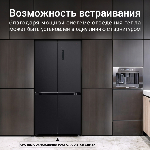 Устройство обладает уникальным дизайном, который позволяет частично встраивать его в кухонный гарнитур: глубина корпуса составляет 60 см, поэтому он может быть установлен в одну линию со стандартной кухонной мебелью. Благодаря инновационной системе охлаждения расстояние от боковых сторон до корпусной мебели может составлять всего 5 мм. Таким образом исключается перегрев, что способствует продлению срока службы устройства. Продуманная конструкция обеспечивает минимальный зазор при открытии дверей холодильника, что делает удобным его использование в ограниченных пространствах.