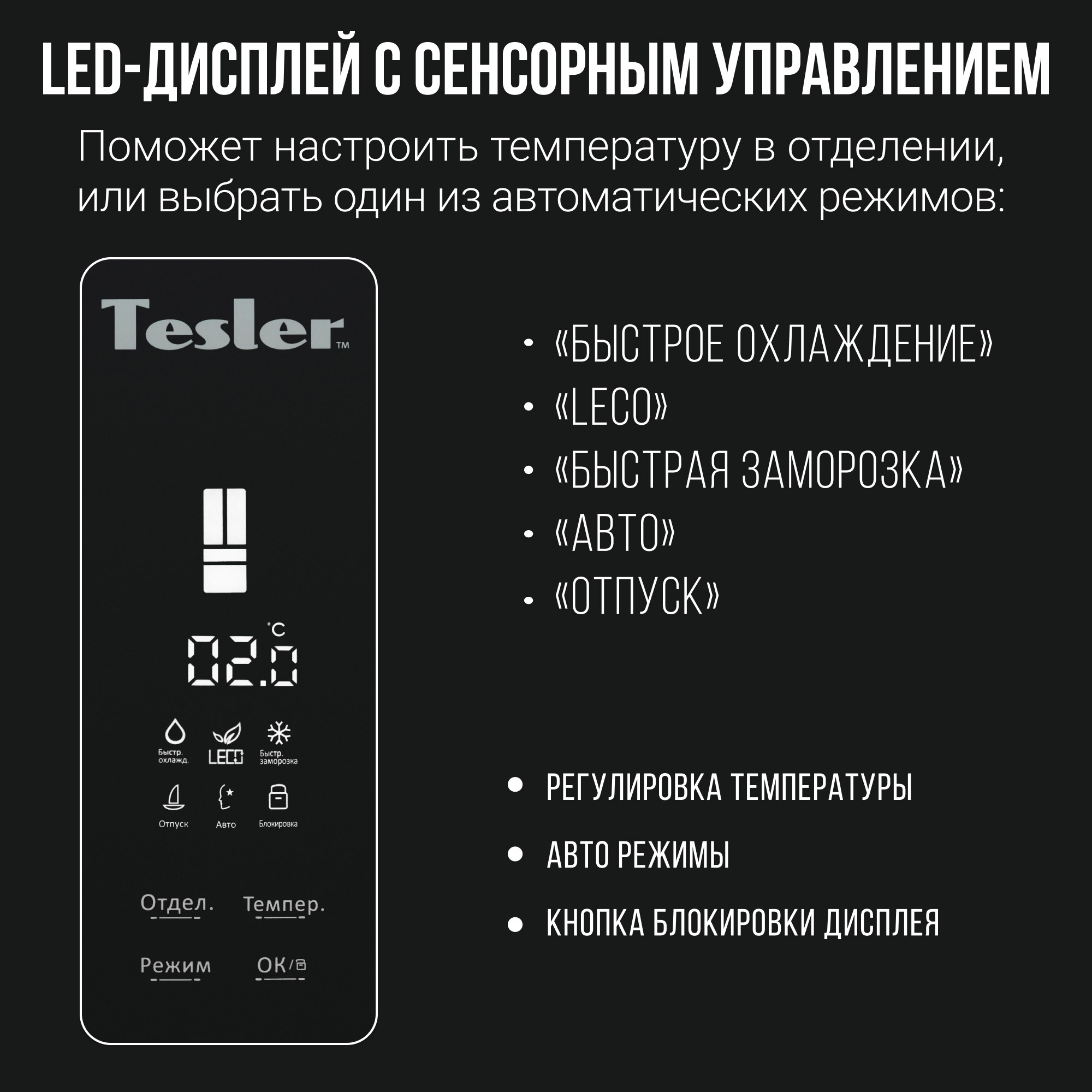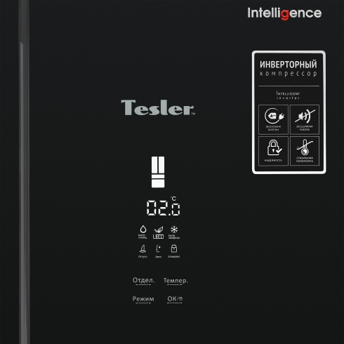 Помимо системы NoFrost, которая обеспечивает удобство использования без разморозки и образования льда в камерах холодильника, модель Tesler Intelligence RFD-361i оснащается системой подсветки Smart Light и зональным фреш-отсеком Intelligent Zone с независимой настройкой влажности. Светодиодный LED дисплей приятного для глаза белого цвета и сенсорная панель помогает точно контролировать параметры температуры в обеих камерах холодильника. Предусмотрены режимы заморозки: "Авто", "Быстрая заморозка" и "Быстрое охлаждение".