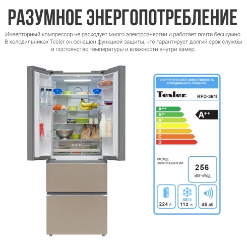 Холодильники серии Tesler Intelligence RFD-361i оснащены современными компрессорами инверторного типа, которые позволяют не только сэкономить электроэнергию, но и значительно снизить шум при работе. Отдельно заслуживают внимания материалы, которые используются в отделке холодильников Tesler. Взгляд или прикосновение, осязание поверхности - Вы гарантировано получите приятные ощущения! Будь то пластик, металл или стекло Вы можете с уверенностью рассчитывать на бескомпромиссное качество, а следовательно и долговечность. Все используемые материалы экологичны и безвредны для здоровья.