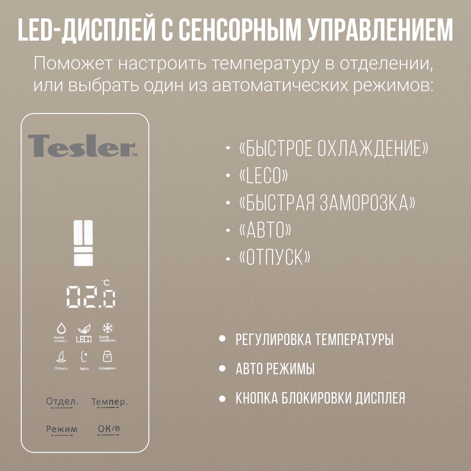 Помимо системы NoFrost, которая обеспечивает удобство использования без разморозки и образования льда в камерах холодильника, модель Tesler Intelligence RFD-361i оснащается системой подсветки Smart Light и зональным фреш-отсеком Intelligent Zone с настройкой влажности. Светодиодный LED дисплей приятного для глаза белого цвета и сенсорная панель помогает точно контролировать параметры температуры в обеих камерах холодильника. Предусмотрены режимы заморозки: "Авто", "Быстрая заморозка" и "Быстрое охлаждение".