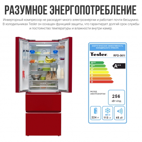Холодильники серии Tesler Intelligence RFD-361i оснащены современными компрессорами инверторного типа, которые позволяют не только сэкономить электроэнергию, но и значительно снизить шум при работе. Отдельно заслуживают внимания материалы, которые используются в отделке холодильников Tesler. Взгляд или прикосновение, осязание поверхности - Вы гарантировано получите приятные ощущения! Будь то пластик, металл или стекло Вы можете с уверенностью рассчитывать на бескомпромиссное качество, а следовательно и долговечность. Все используемые материалы экологичны и безвредны для здоровья.
