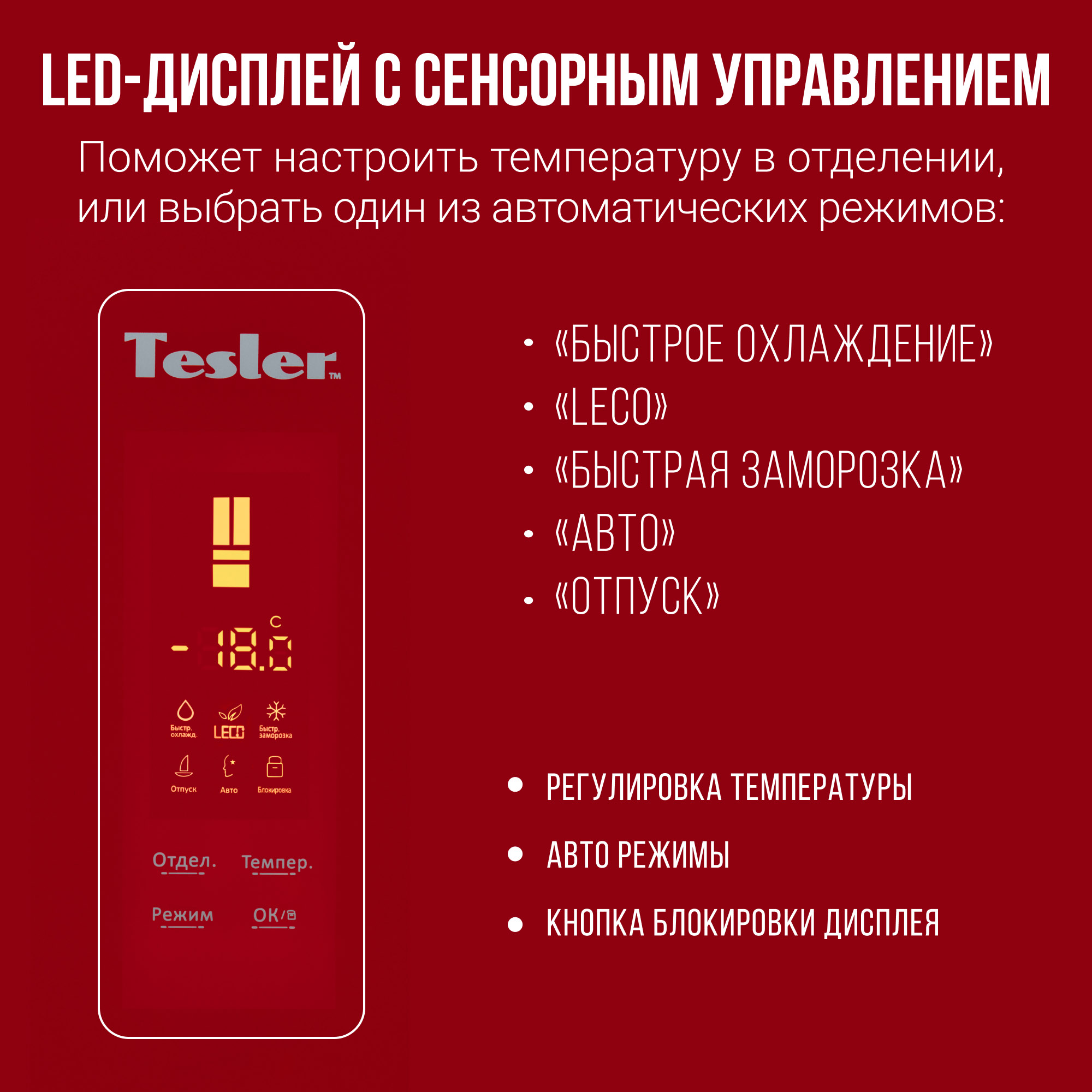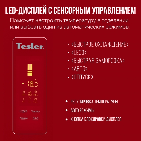 Помимо системы NoFrost, которая обеспечивает удобство использования без разморозки и образования льда в камерах холодильника, модель Tesler Intelligence RFD-361i оснащается системой подсветки Smart Light и зональным фреш-отсеком Intelligent Zone с настройкой влажности. Светодиодный LED дисплей приятного для глаза белого цвета и сенсорная панель помогает точно контролировать параметры температуры в обеих камерах холодильника. Предусмотрены режимы заморозки: "Авто", "Быстрая заморозка" и "Быстрое охлаждение".