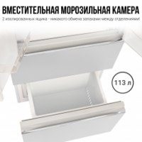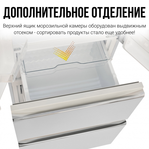 Верхний ящик морозильной камеры оборудован выдвижным отсеком - сортировать продукты стало еще удобнее! Здесь можно хранить компактные упаковки, например, мороженое, замороженные полуфабрикаты, масло, молоко или лёд.