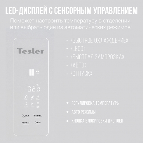 Помимо системы NoFrost, которая обеспечивает удобство использования без разморозки и образования льда в камерах холодильника, модель Tesler Intelligence RFD-361i оснащается системой подсветки Smart Light и зональным фреш-отсеком Intelligent Zone с настройкой влажности. Светодиодный LED дисплей приятного для глаза белого цвета и сенсорная панель помогает точно контролировать параметры температуры в обеих камерах холодильника. Предусмотрены режимы заморозки: "Авто", "Быстрая заморозка" и "Быстрое охлаждение".