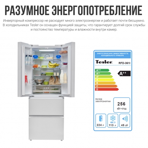 Холодильники серии Tesler RFD-361i отличаются высокой вместительностью благодаря полезному объему в 337 литров. Удобно расположить продукты питания теперь не проблема, а система дверей French Door (Френч-дор) обеспечивает максимально лёгкий доступ ко всему содержимому холодильника. Морозильное отделение делят на две части 2 независимых ящика, а значит никакого обмена запахами между продуктами и потерь холода при открывании.
