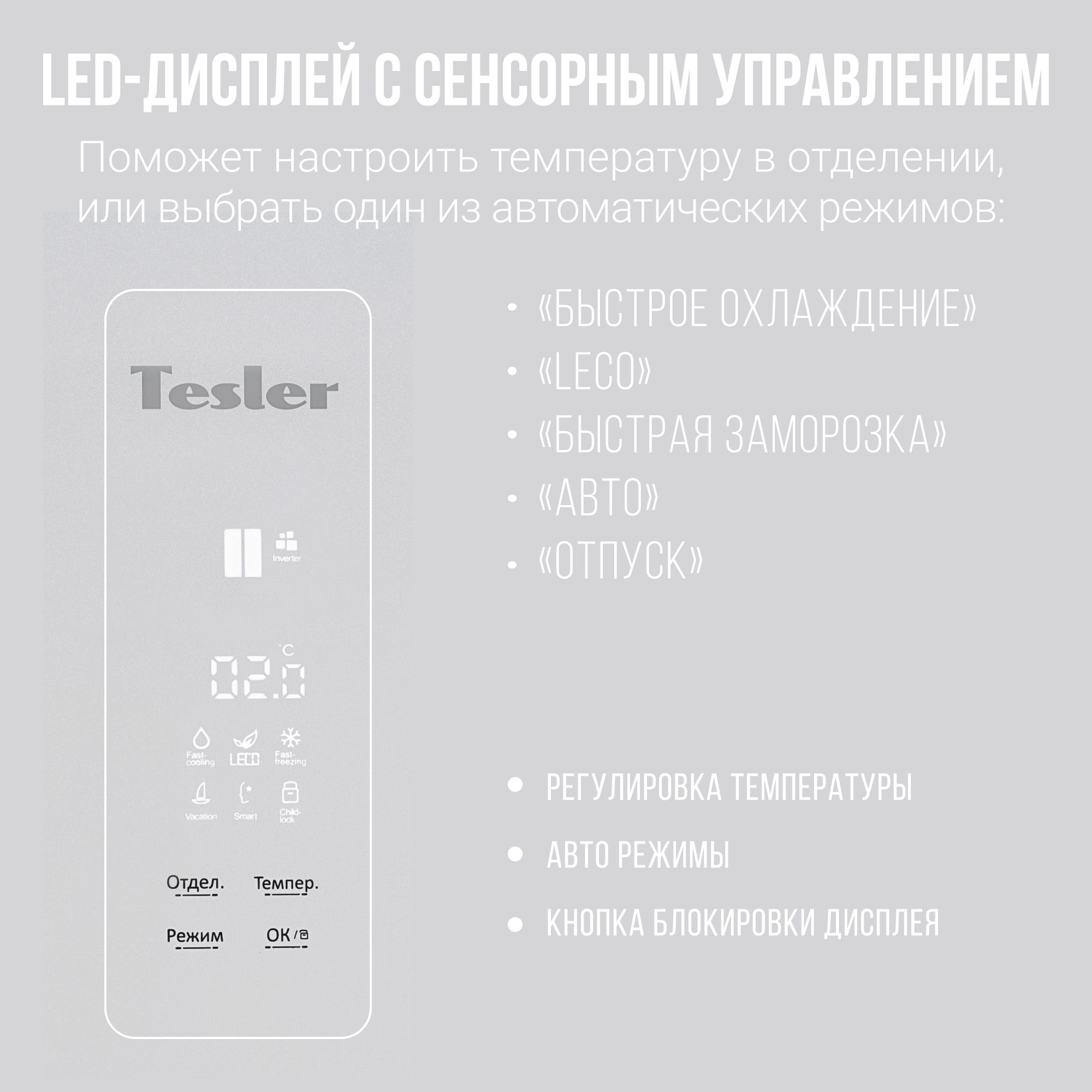 Помимо системы NoFrost, которая обеспечивает удобство использования без разморозки и образования льда в камерах холодильника, модель Tesler Intelligence RFD-361i оснащается системой подсветки Smart Light и зональным фреш-отсеком Intelligent Zone с настройкой влажности. Светодиодный LED дисплей приятного для глаза белого цвета и сенсорная панель помогает точно контролировать параметры температуры в обеих камерах холодильника. Предусмотрены режимы заморозки: "Авто", "Быстрая заморозка" и "Быстрое охлаждение".