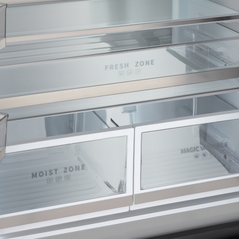Большой полезный объем холодильника в 413 литров предоставит достаточно места для хранения продуктов и напитков. Холодильное отделение с полезным объемом 250 л оборудовано просторными полками и дверными карманами, некоторые из которых вы можете убрать в случае необходимости. Отсек с повышенной влажностью и отделение с вариативной температурой помогут создать оптимальные условия для различных видов продуктов, сохраняя их свежесть и вкус. Над ними располагается фреш-зона для овощей и фруктов.