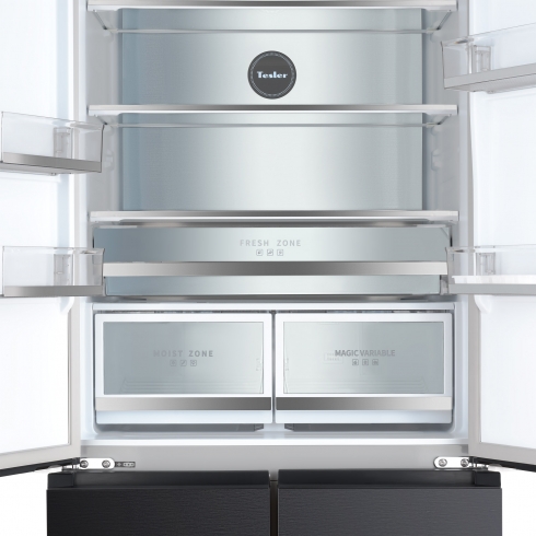 • Частично встраиваемый холодильник Tesler RFD-427BI может быть установлен в одну линию с кухонным гарнитуром благодаря инновационной системе охлаждения.