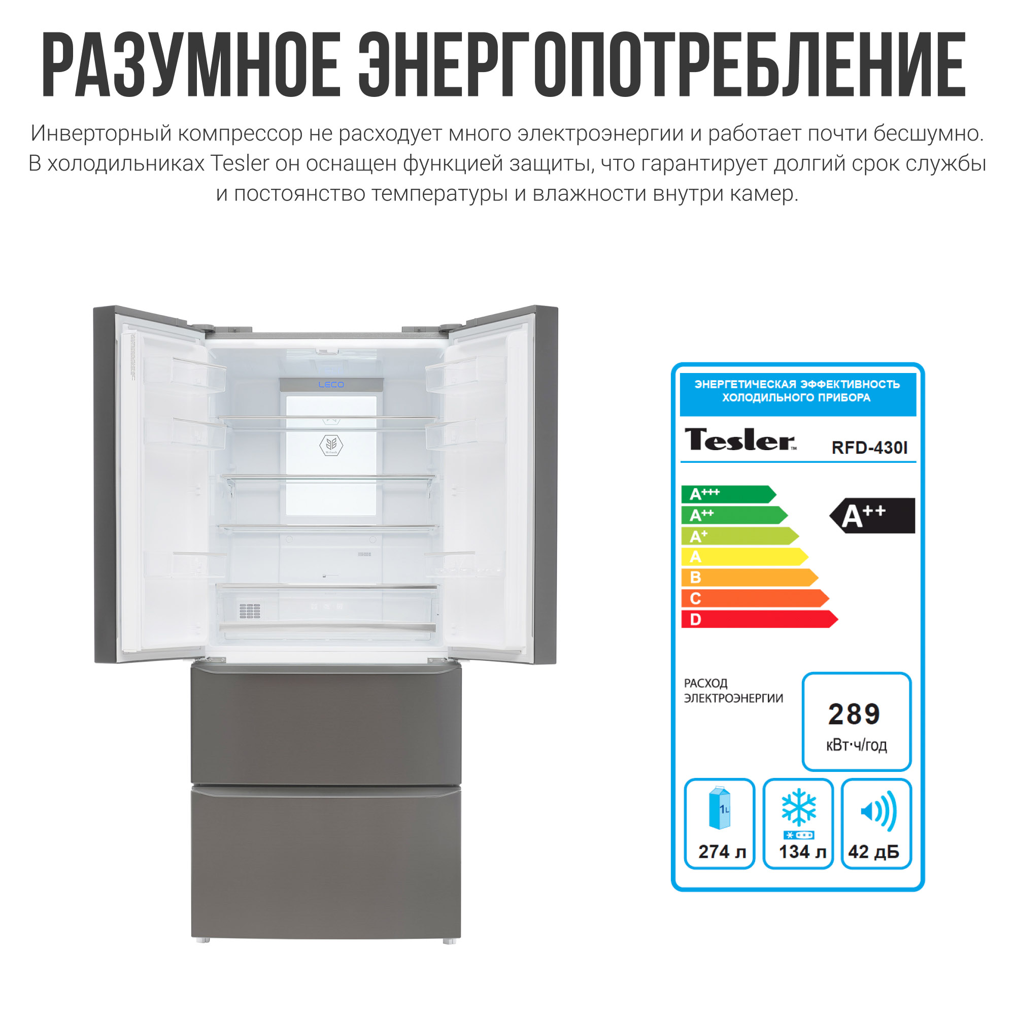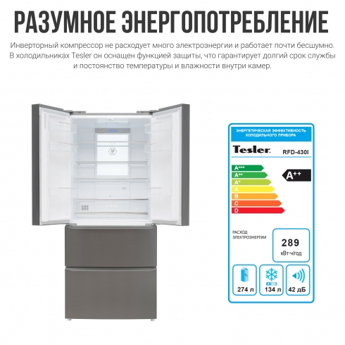Холодильники серии Tesler Intelligence RFD-430i оснащены современными компрессорами инверторного типа, которые позволяют не только сэкономить электроэнергию, но и значительно снизить шум при работе. Отдельно заслуживают внимания материалы, которые используются в отделке холодильников Tesler. Взгляд или прикосновение, осязание поверхности - Вы гарантировано получите приятные ощущения! Будь то пластик, металл или стекло Вы можете с уверенностью рассчитывать на бескомпромиссное качество, а следовательно и долговечность. Все используемые материалы экологичны и безвредны для здоровья.