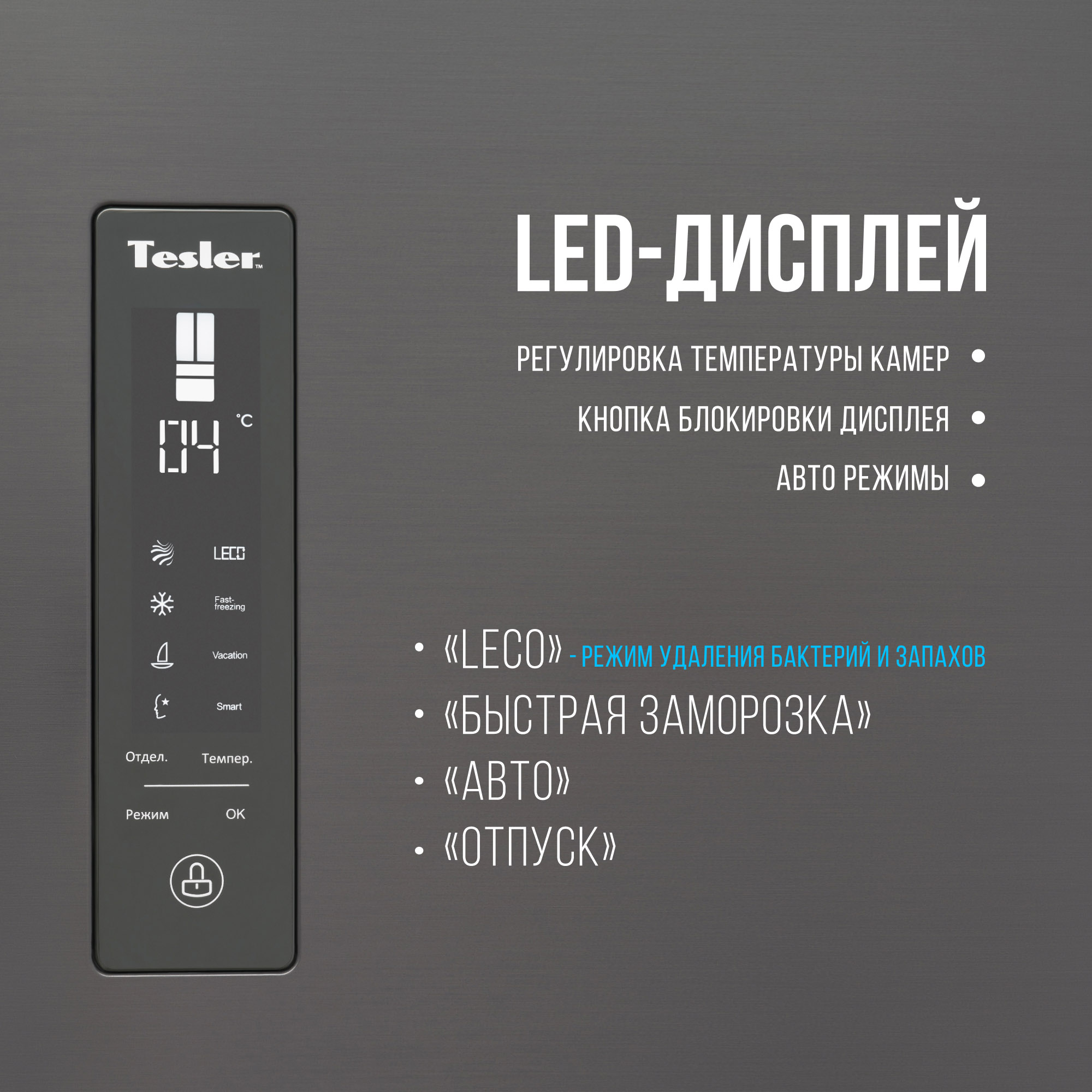 Помимо системы NoFrost, которая обеспечивает удобство использования без разморозки и образования льда в камерах холодильника, модель Tesler Intelligence RFD-430i оснащается системой подсветки Smart Light и зональным фреш-отсеком Intelligent Zone с независимой настройкой влажности. Светодиодный LED дисплей приятного для глаза белого цвета и сенсорная панель помогает точно контролировать параметры температуры в обеих камерах холодильника. Предусмотрены режимы заморозки: "Авто", "Быстрая заморозка" и "Быстрое охлаждение".