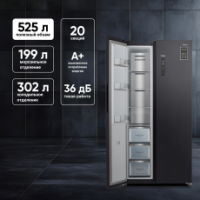 Большой полезный объем холодильника в 525 л обеспечивает простор для хранения продуктов разных видов и размеров. Холодильное отделение с полезным объемом 302 л оборудовано вместительными полками и дверными карманами, некоторые из которых вы можете убрать в случае необходимости. Отсек с повышенной влажностью и отделение с вариативной температурой помогут создать оптимальные условия для различных видов продуктов, сохраняя их свежесть и вкус.