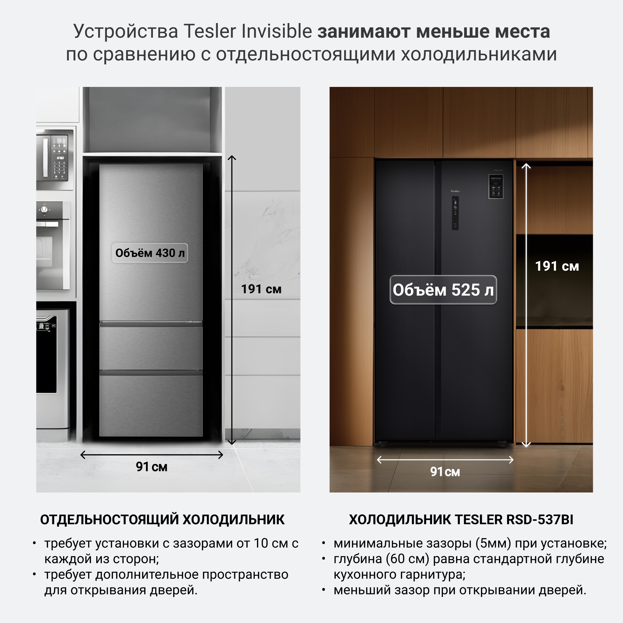 Холодильник Tesler RSD-537BI – это идеальное сочетание стиля и функциональности, предлагающее пользователю передовые технологии и рациональную организацию пространства. Двухдверная конструкция Side By Side представляет из себя две независимые камеры, делящие устройство на холодильное и морозильное отделения. Пространство каждого организовано с учетом максимальной практичности и удобства в использовании.
