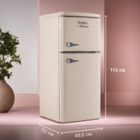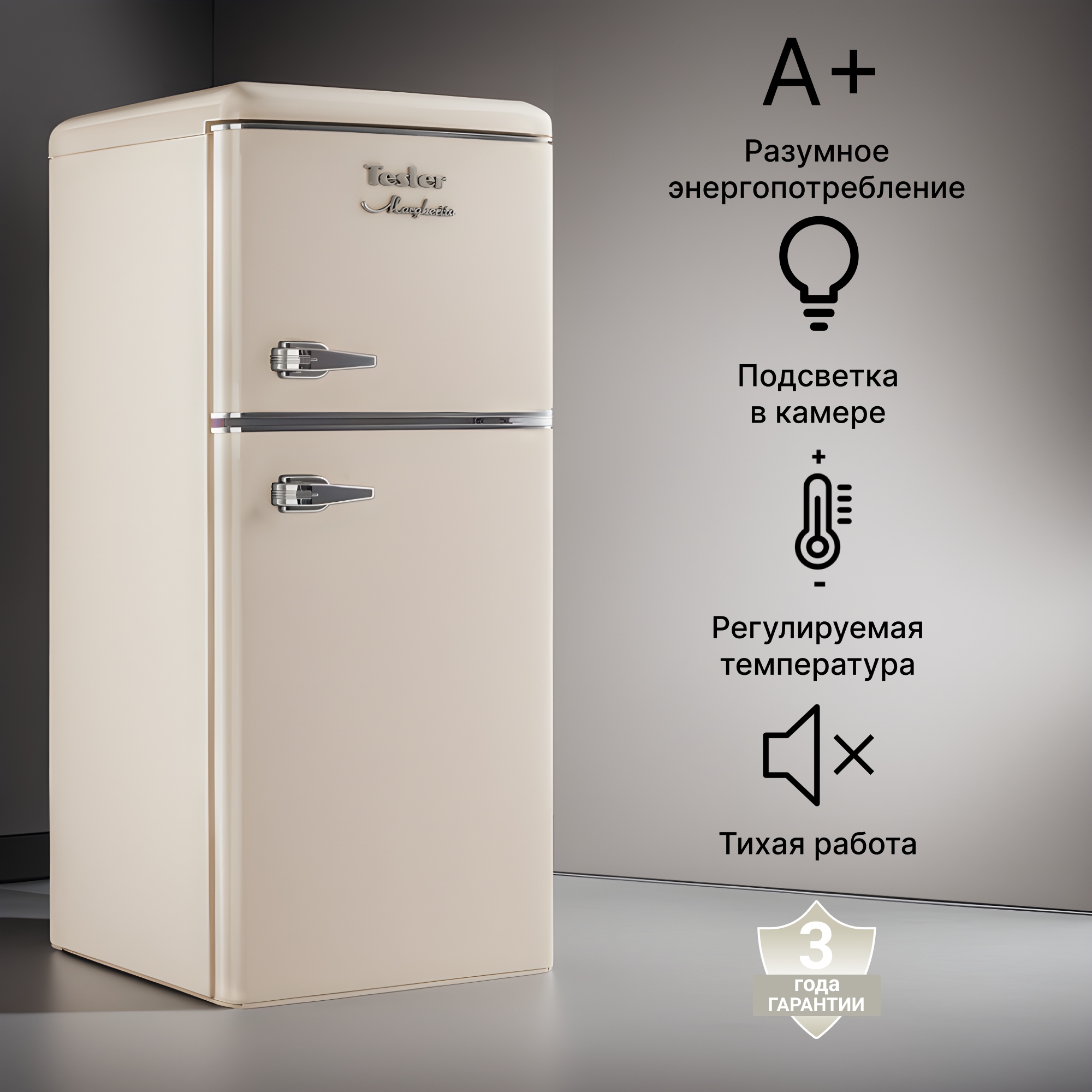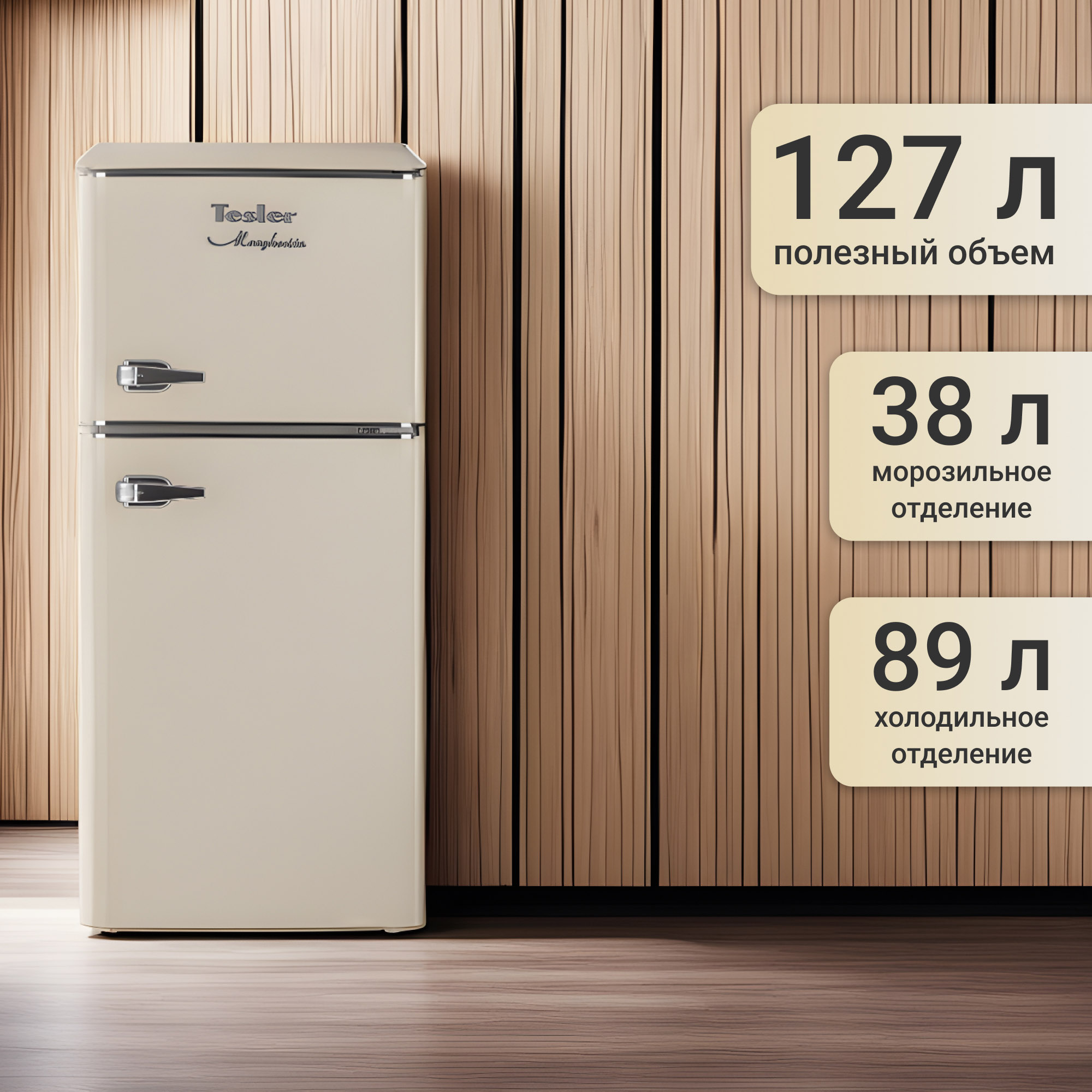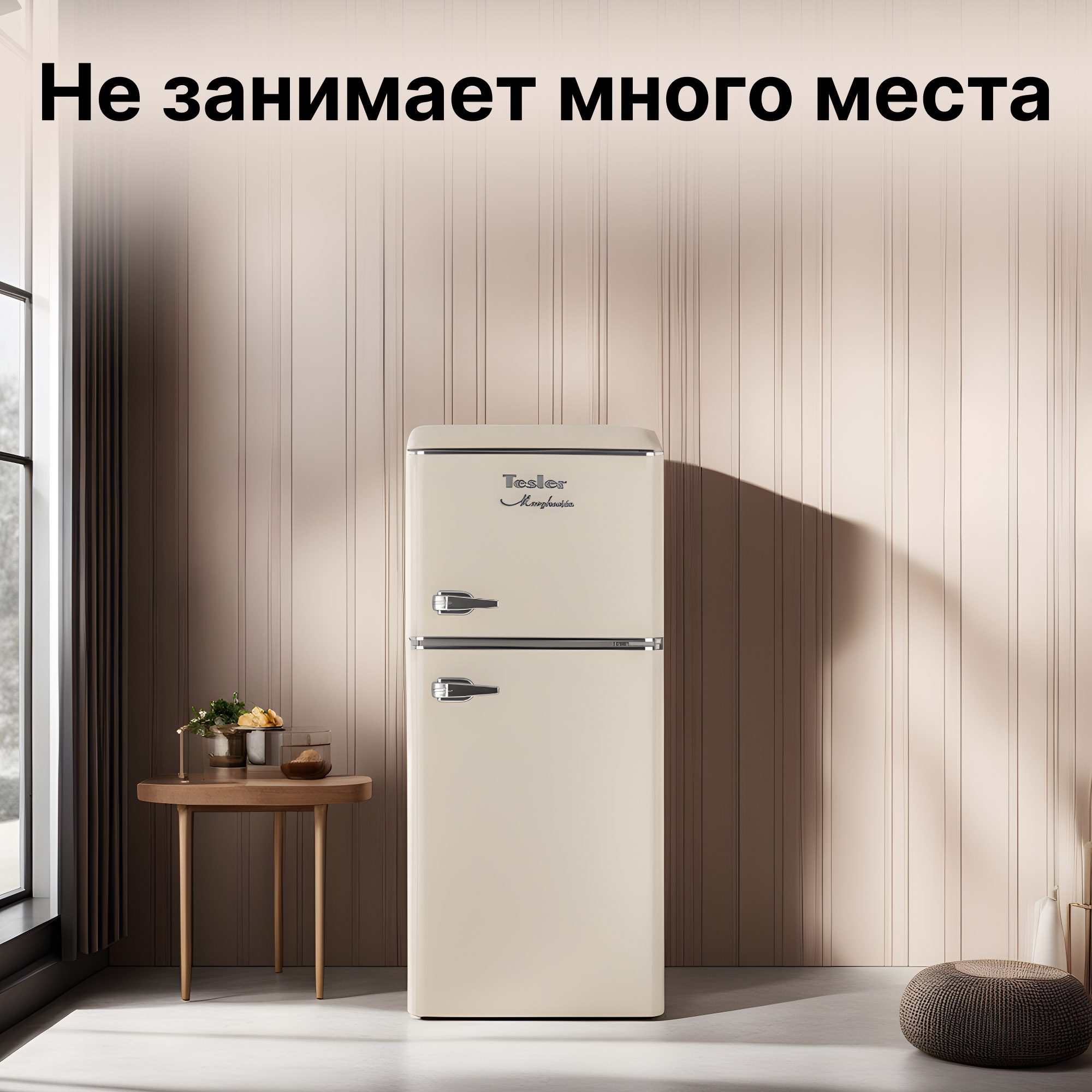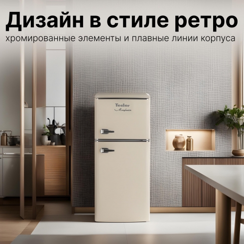 Tesler RT-132 сочетает в себе надежное охлаждение, элегантность и функциональность. Выполненный в ретро-стиле, он придаёт особый шарм пространству вокруг, что делает его идеальным дополнением к кухне. Хромированные ручки с надёжным креплением не ослабнут независимо от того, как часто вы открываете дверцы.