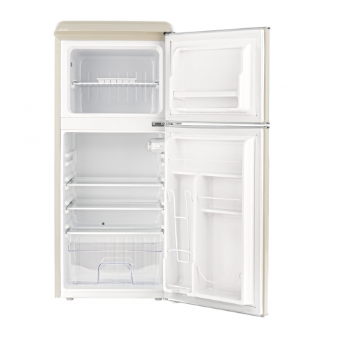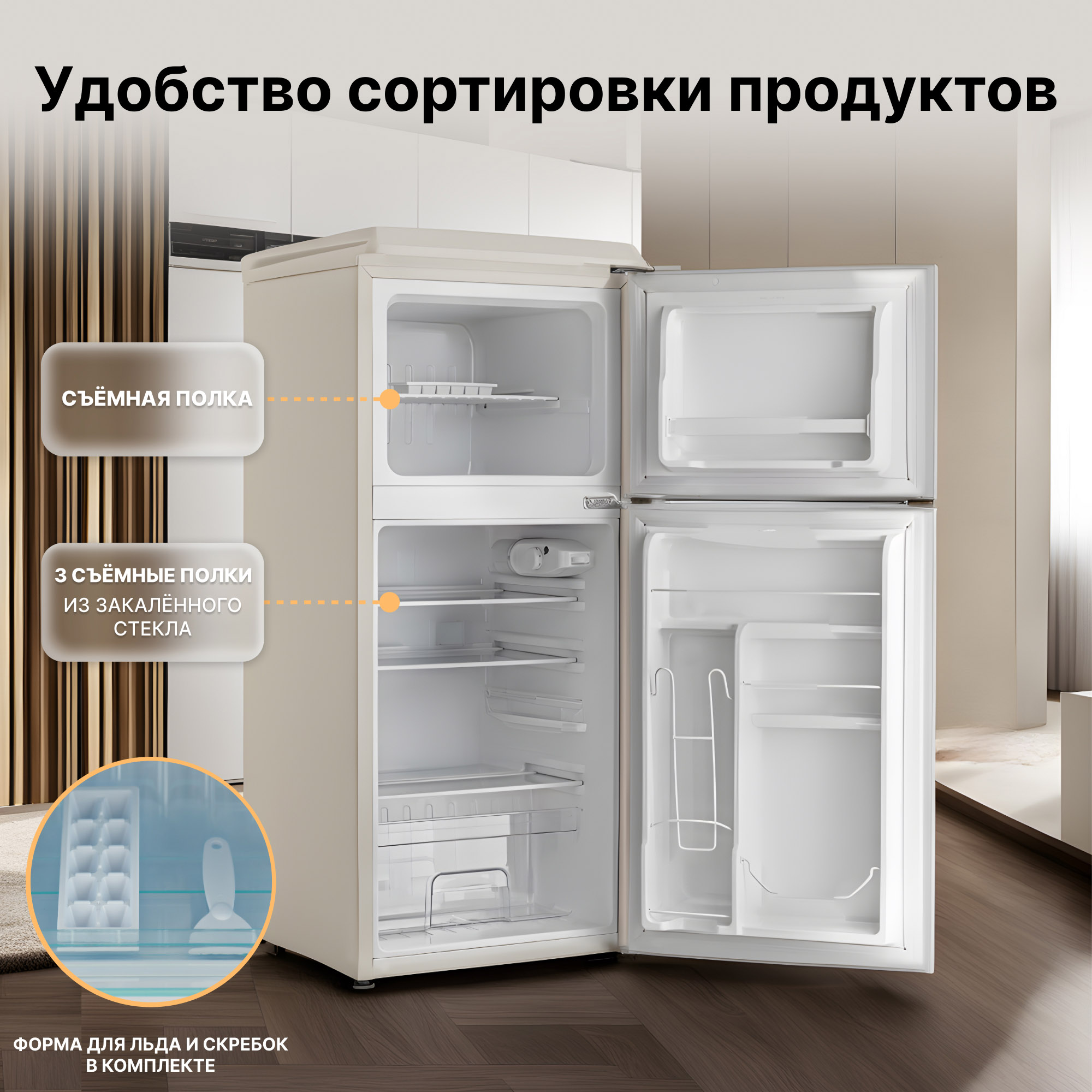Функциональный и элегантный, двухкамерный холодильник Tesler RT-132 предлагает все необходимое для эффективного охлаждения продуктов. Несмотря на сравнительно небольшие габариты, он оборудован полноценной морозильной камерой, в которой поддерживается температура -18°С. Эргономичный дизайн внутреннего пространства помогает с комфортом расположить еду и напитки. Холодильное отделение предоставляет полезный объем 89 л, внутреннее освещение облегчает просмотр содержимого. Съемные стеклянные полки можно переставить удобным образом, а внизу располагается вместительный ящик для овощей и фруктов. В дверце помимо полок есть отдел для хранения банок, из которого легко доставать напитки. В отделение помещается 6 банок.