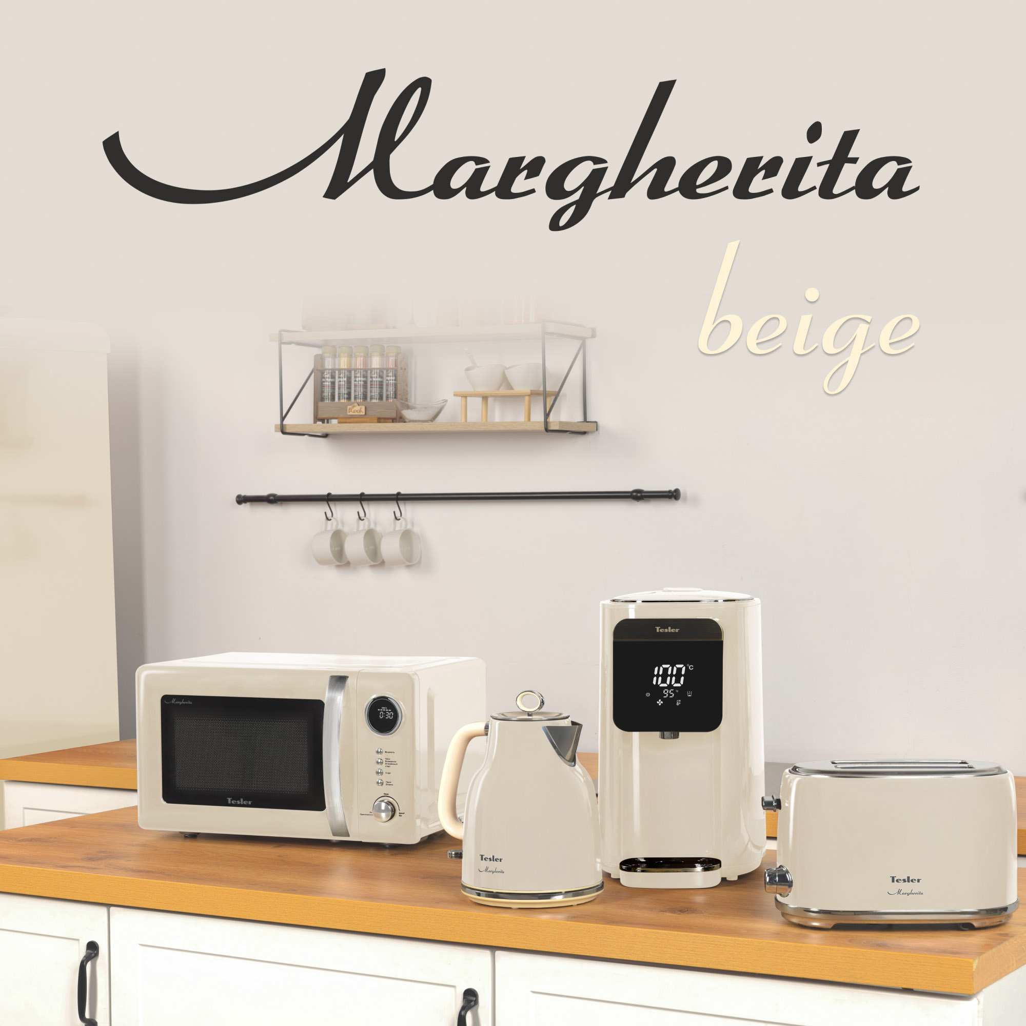 В комплект кухонной техники Tesler Margherita в стиле ретро входят СВЧ-печь, холодильник, чайник, вспениватель молока, кофемашина, тостер и термопот.