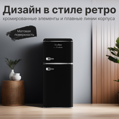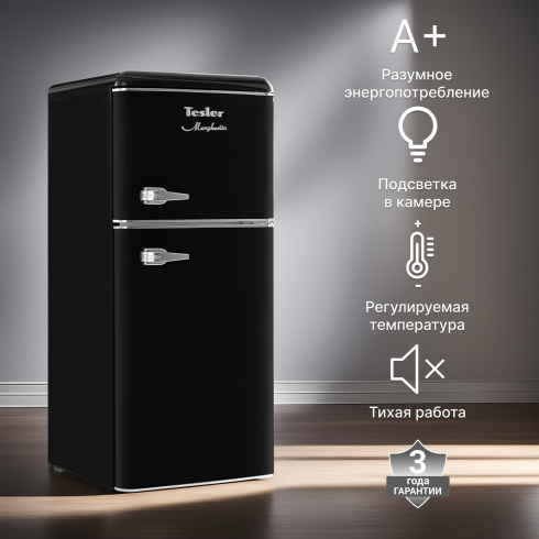 Tesler RT-132 сочетает в себе надежное охлаждение, элегантность и функциональность. Выполненный в ретро-стиле, он придаёт особый шарм пространству вокруг, что делает его идеальным дополнением к кухне. Хромированные ручки с надёжным креплением не ослабнут независимо от того, как часто вы открываете дверцы.