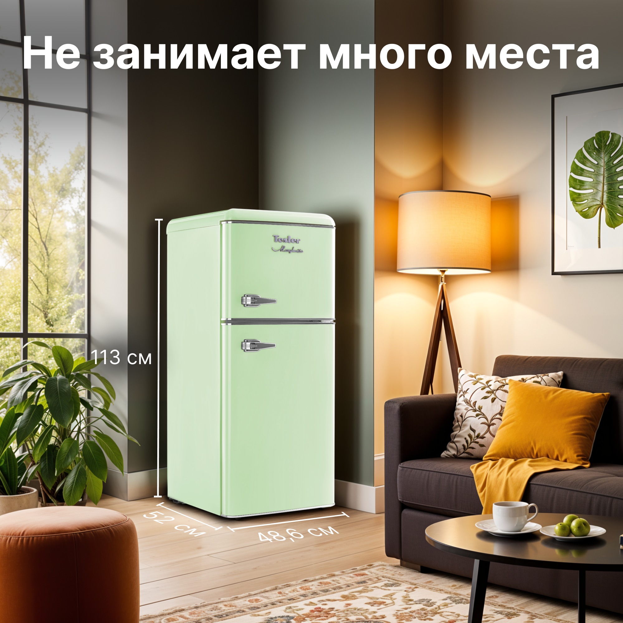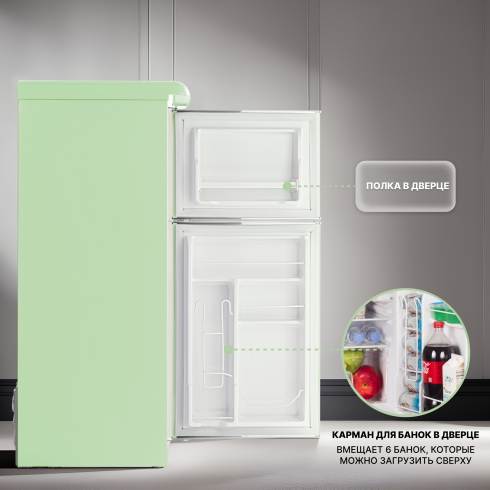 Tesler RT-132 сочетает в себе надежное охлаждение, элегантность и функциональность. Выполненный в ретро-стиле, он придаёт особый шарм пространству вокруг, что делает его идеальным дополнением к кухне. Хромированные ручки с надёжным креплением не ослабнут независимо от того, как часто вы открываете дверцы.